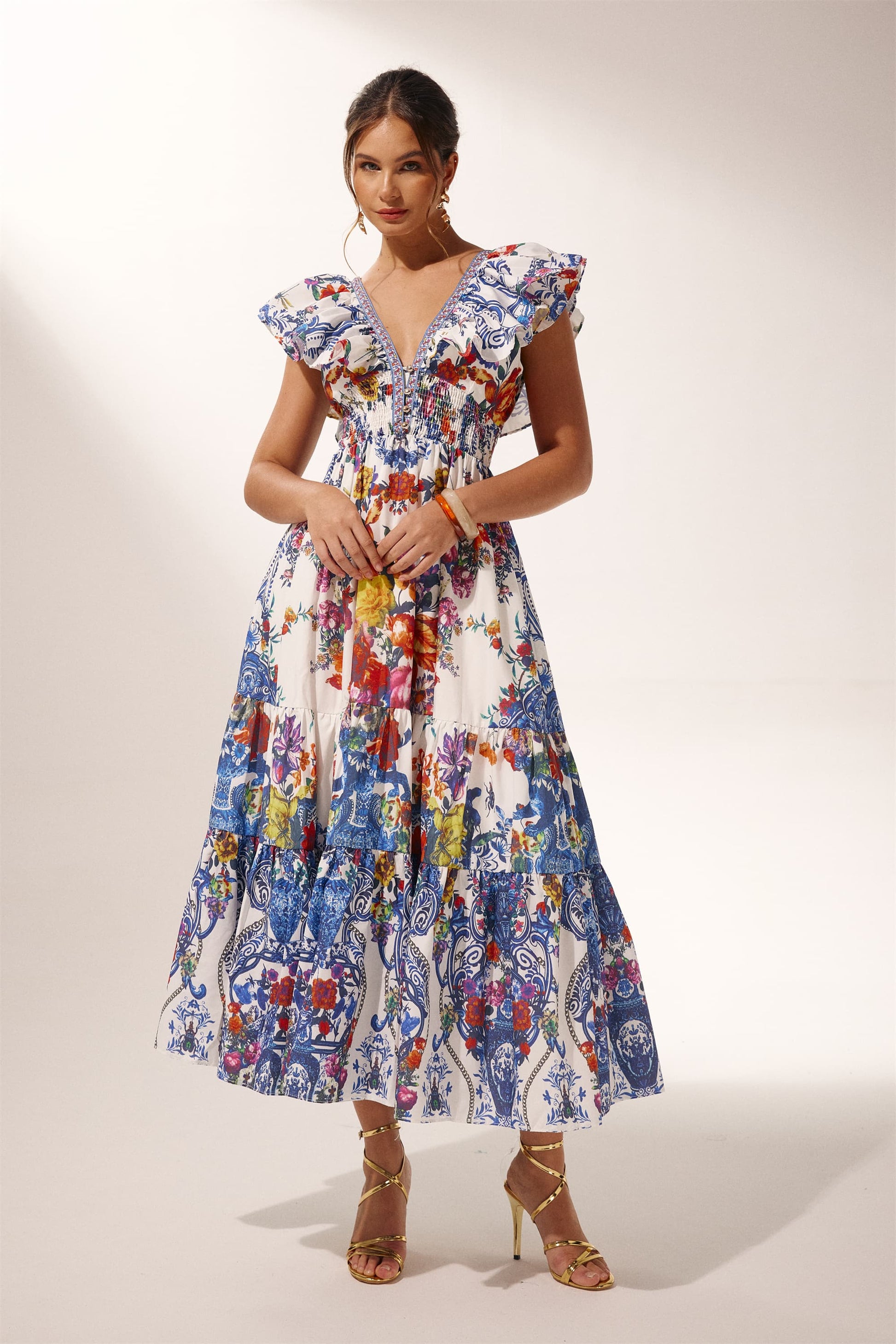 - Neck Frill, Tiered, Elastic Shirring Details, Floral Print, Ruffle Sleeves, Tie Detail At The Back, Maxi Length.
