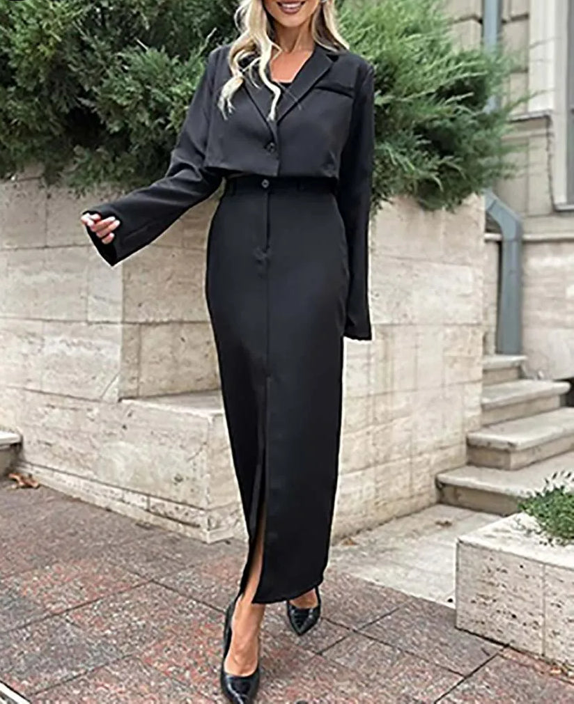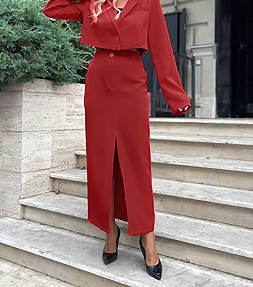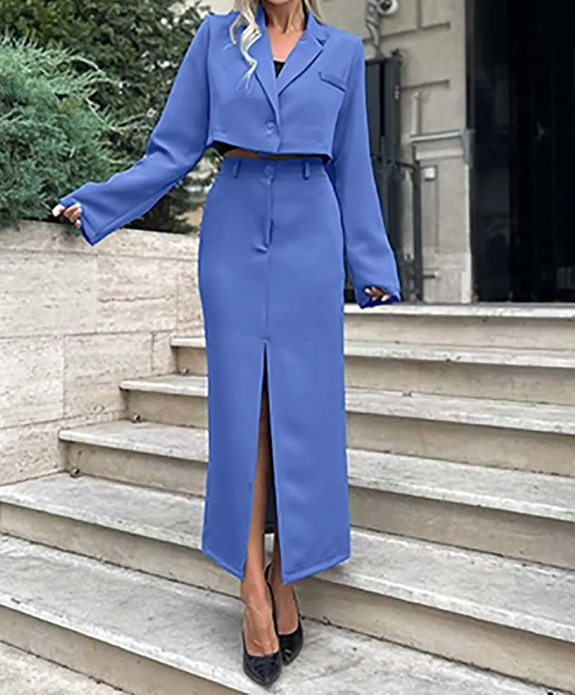 Khaki Single Button Crop Skirt Office Two Piece Set