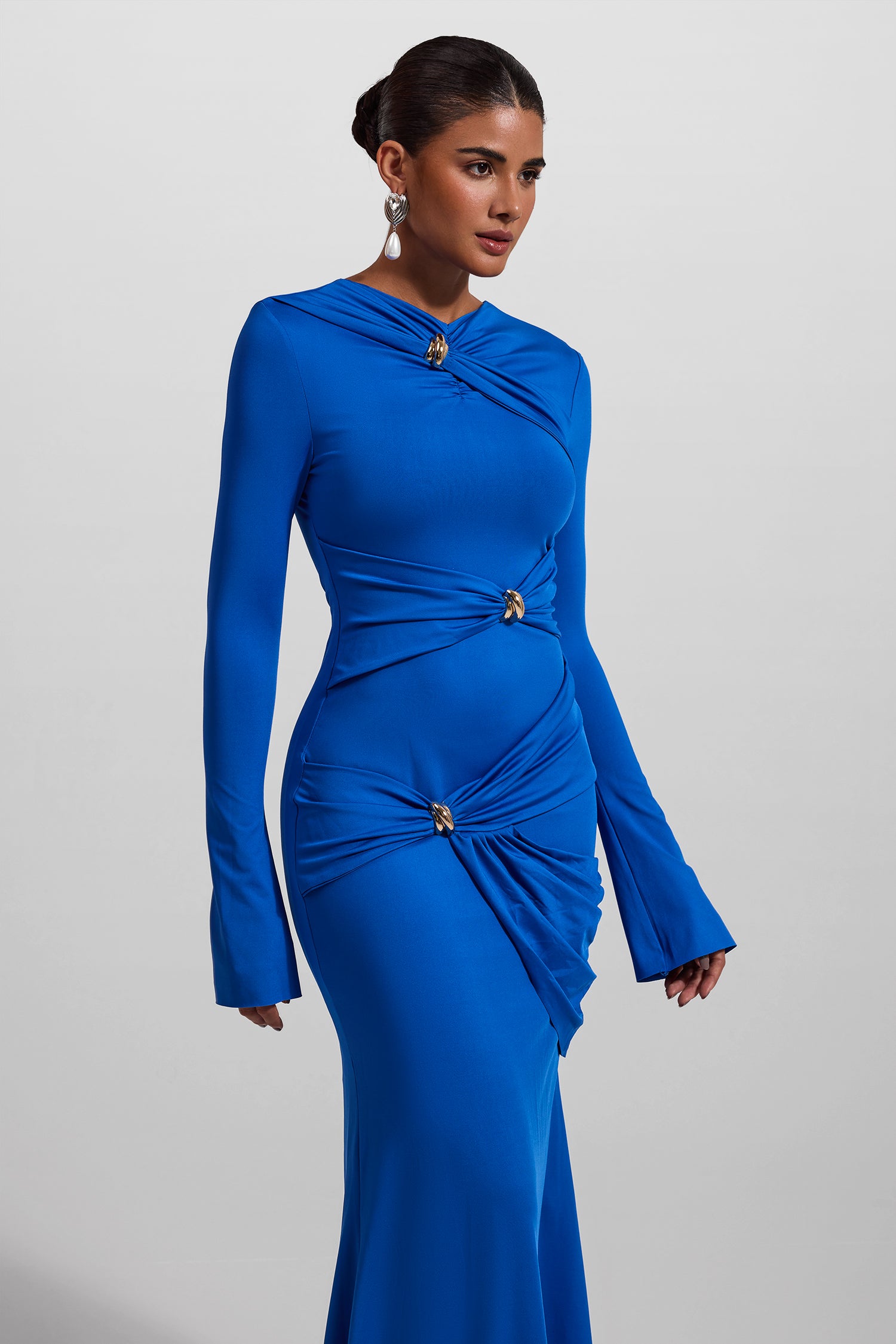 Knit Ruched Long Sleeve Maxi Dress Blue