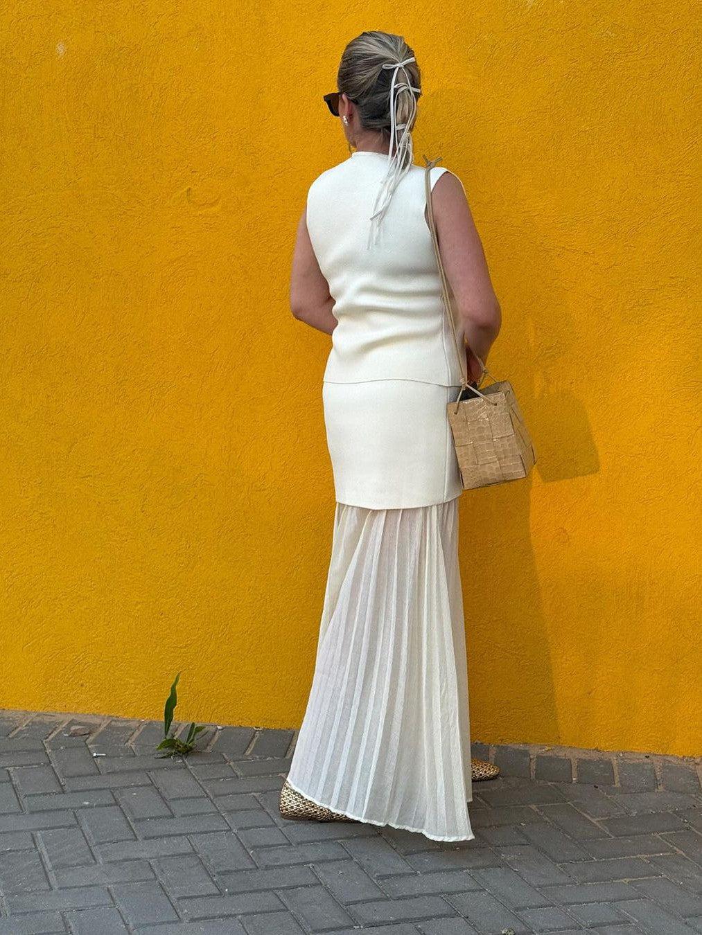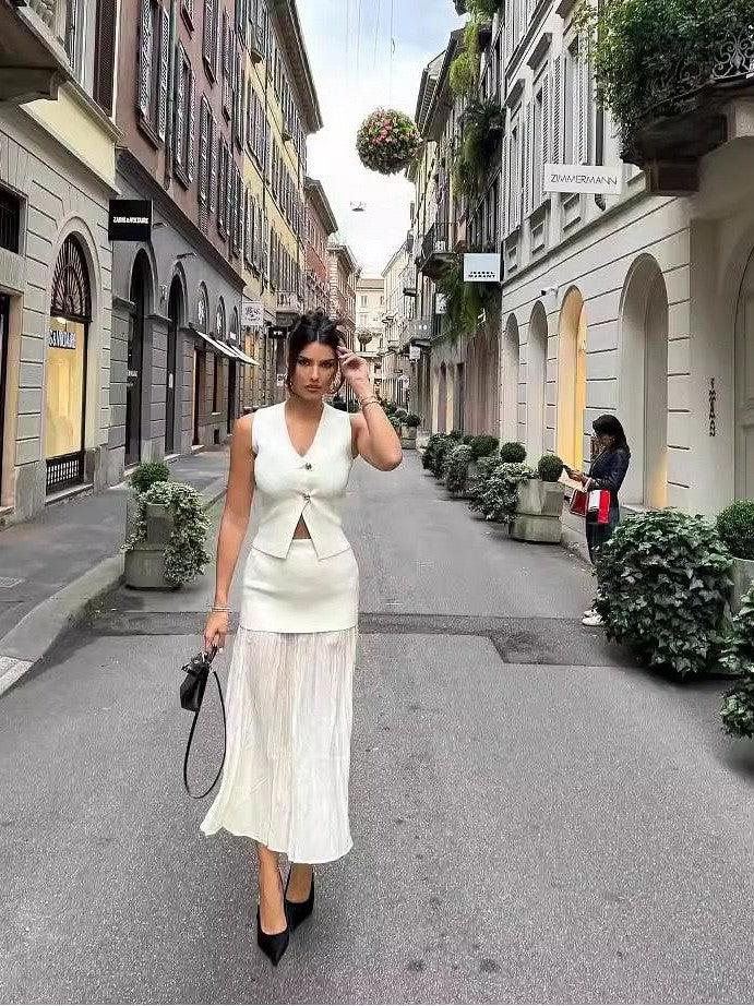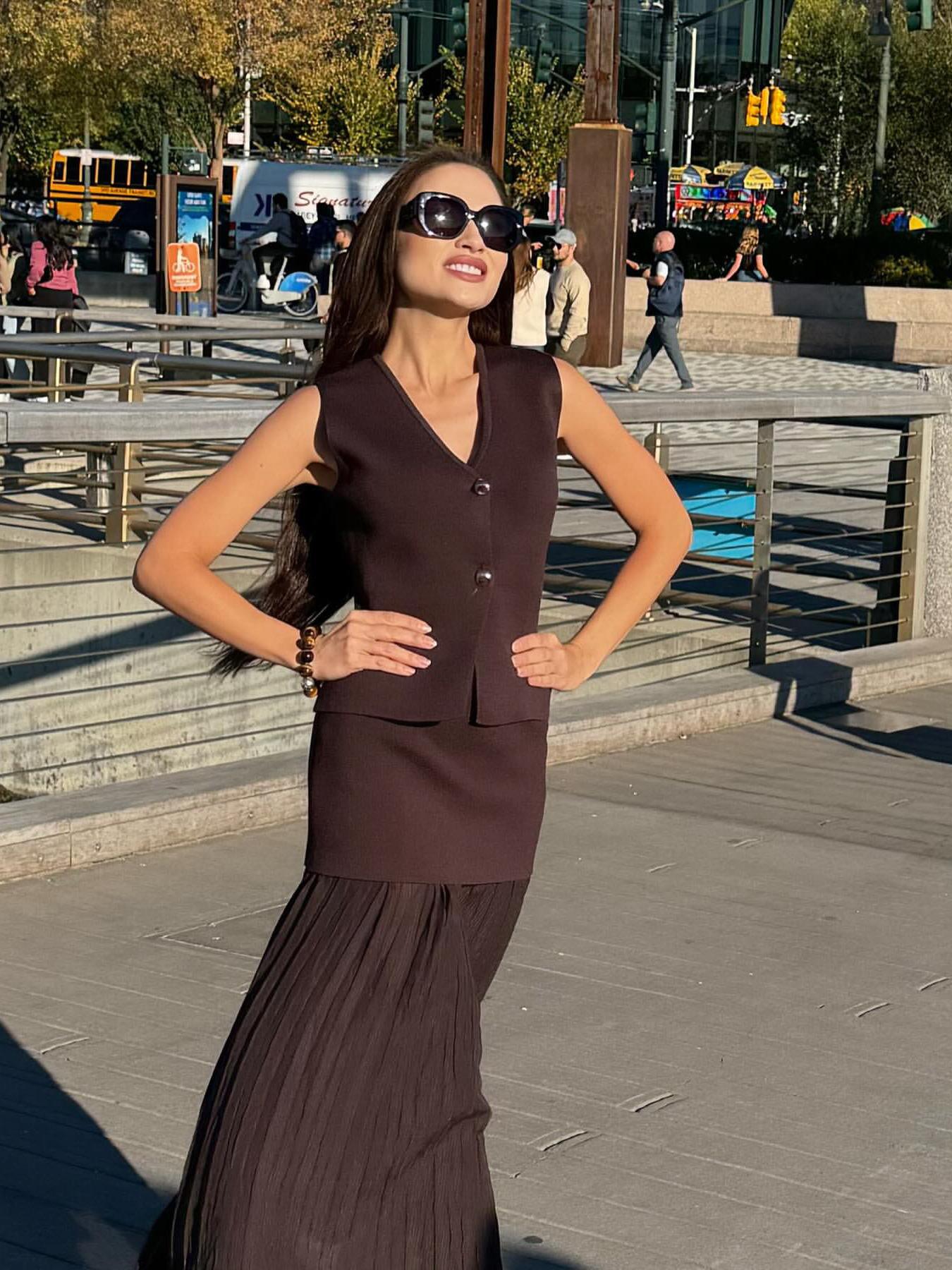 Knitted Vest Coat & Pleated High Waist Skirt Coord Set
