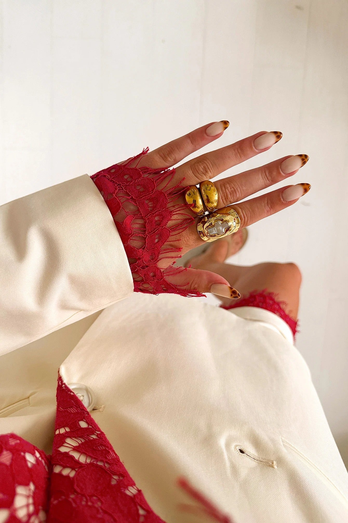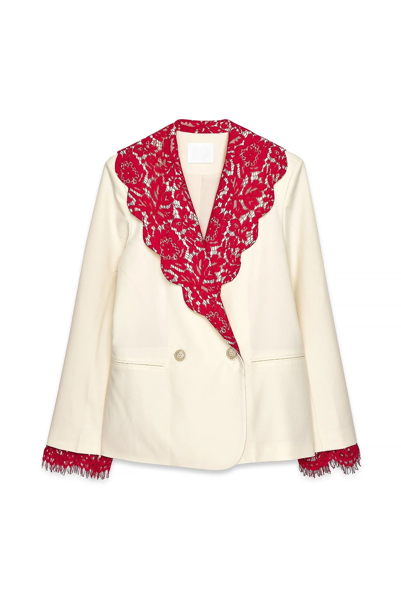 A harmonious blend of tailored sophistication and romantic detailing, this lace-accented blazer and shorts set redefines modern suiting with a feminine twist. The off-white hue and delicate lace embellishments create a look that’s equally suited for garden parties, bridal events, or polished daytime ensembles.