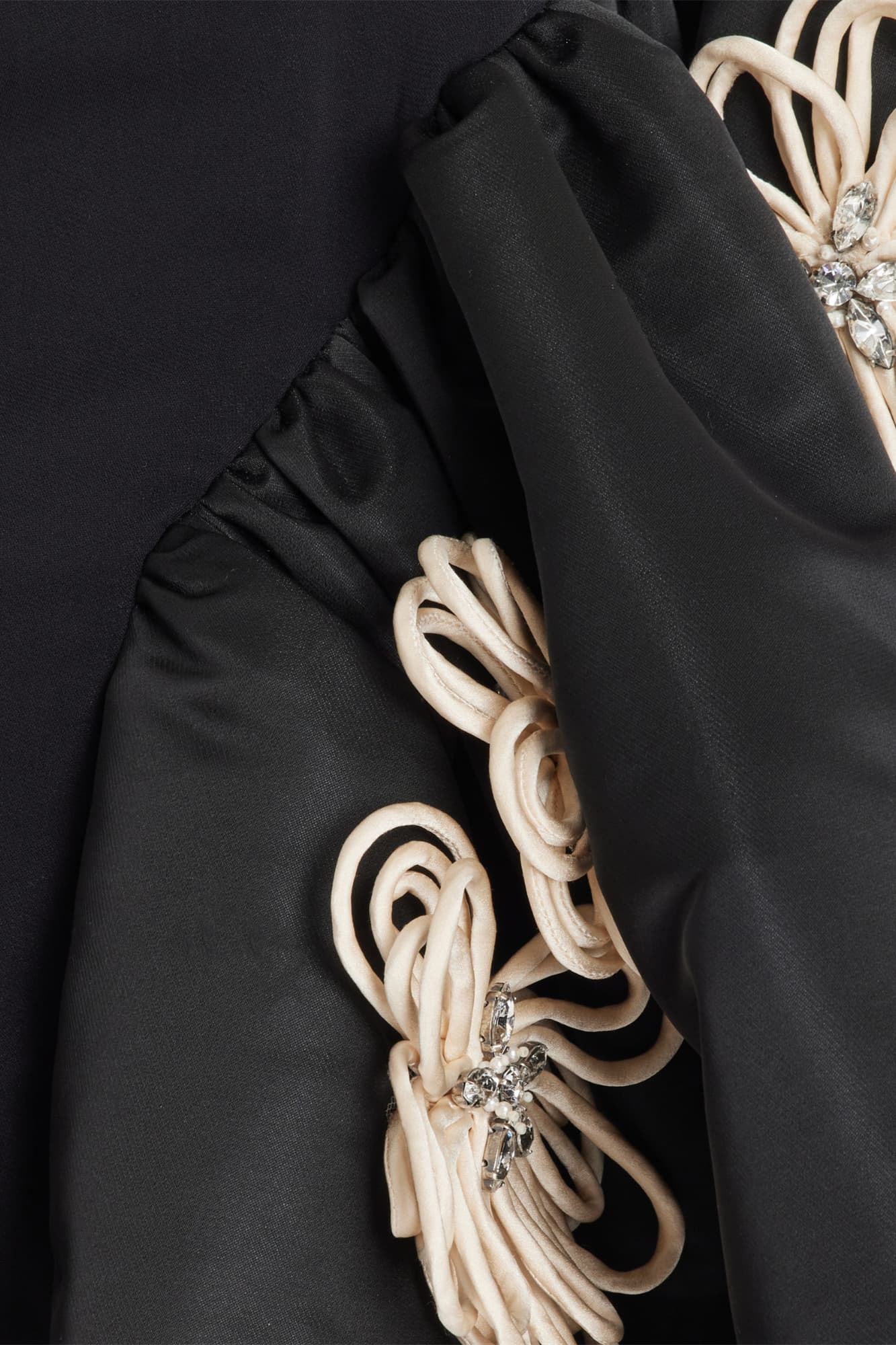 - Sculpted Waist, Bubble Skirt Silhouette, Floral Appliqués, Mini Length.