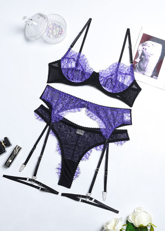 Leona - Purple Lace Underwire Lingerie Set with Garter Straps