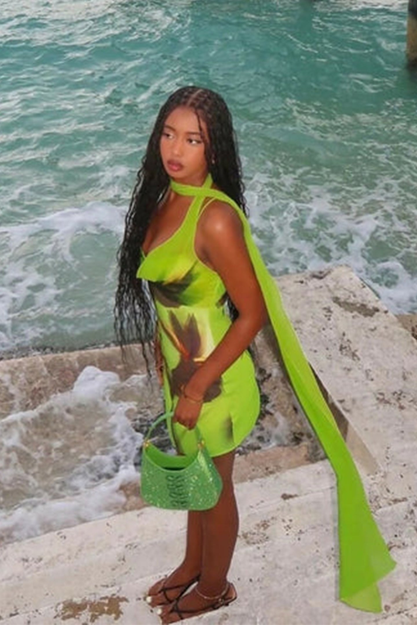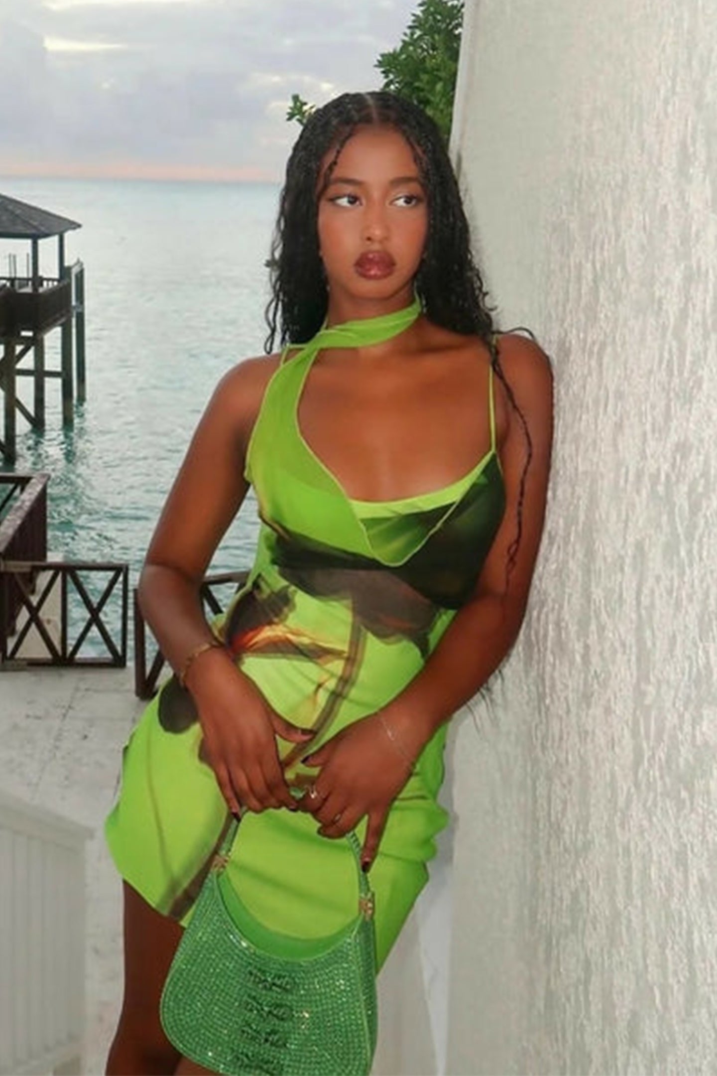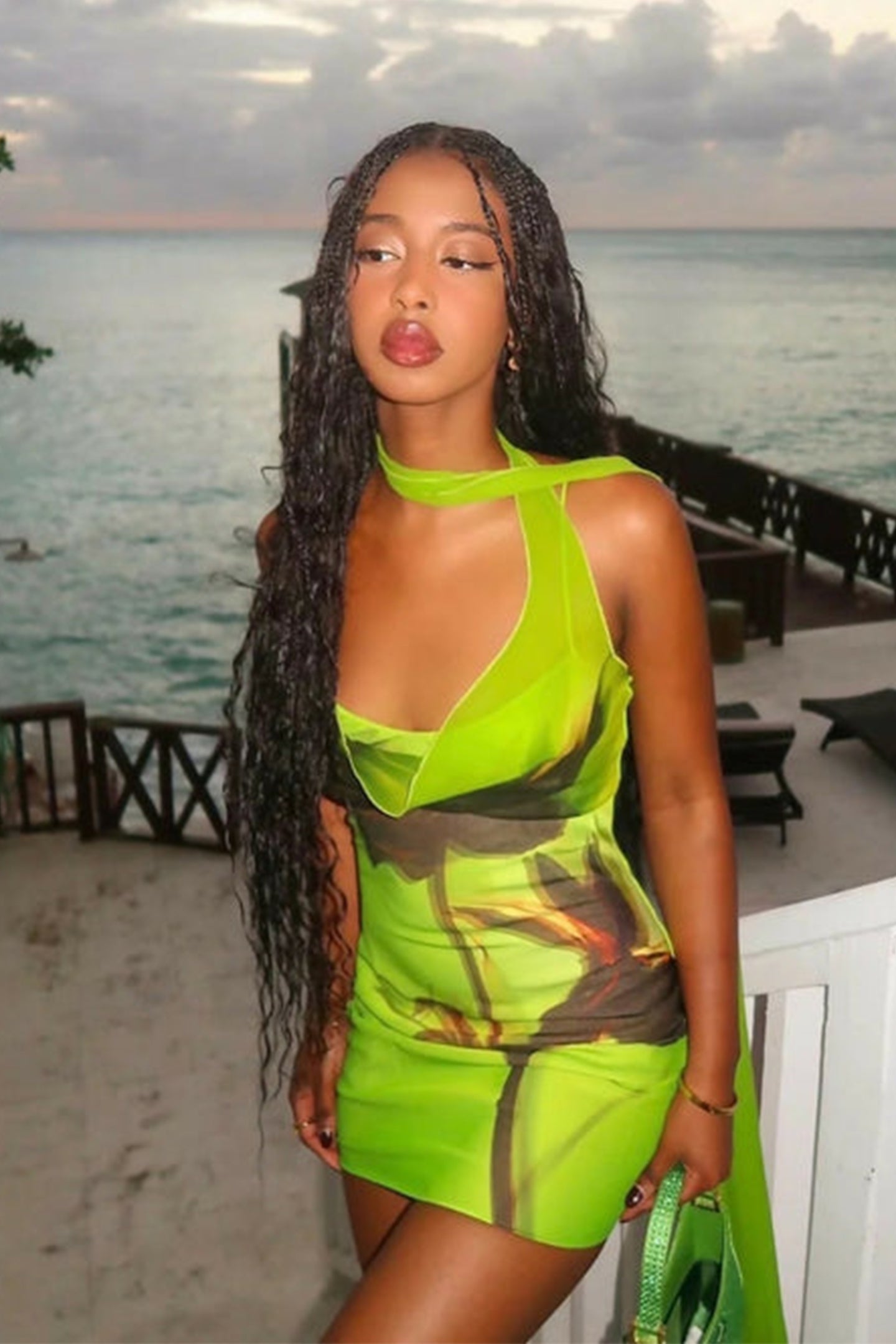 Cowl Neck, Floral Print, Draped Scarf, Spaghetti Straps, Mini Length.