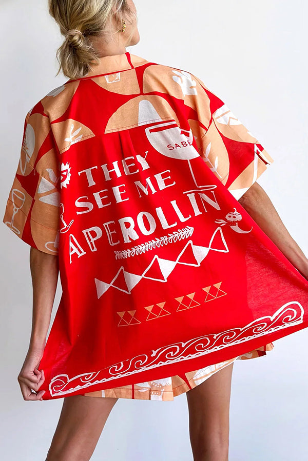 Linen Blend Unique Printed Shirt Top and Elastic Waisted Loose Pocket Shorts Set