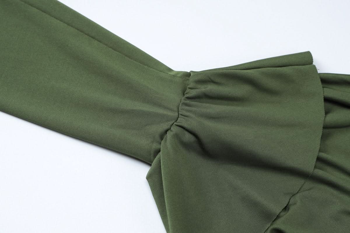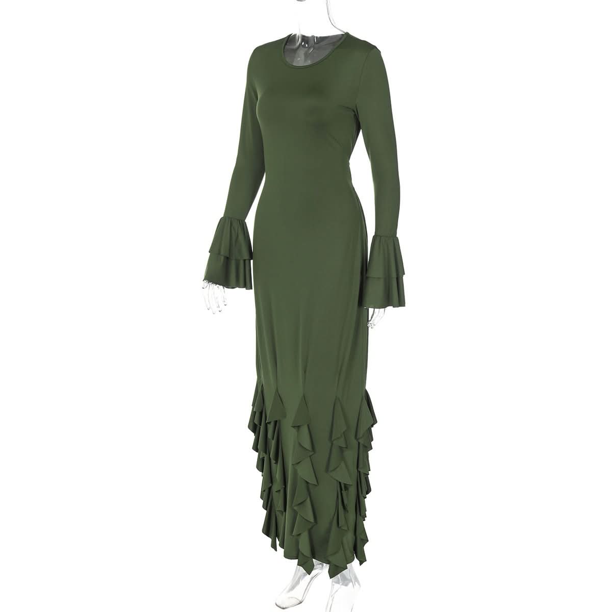 Long flared sleeve crewneck ruffle self tie maxi dress