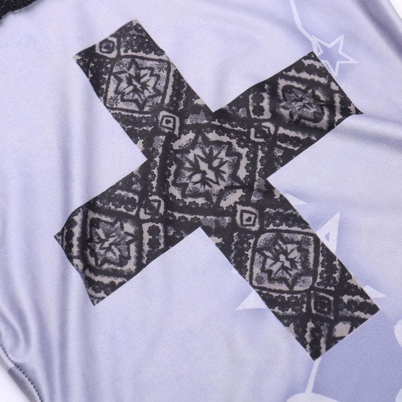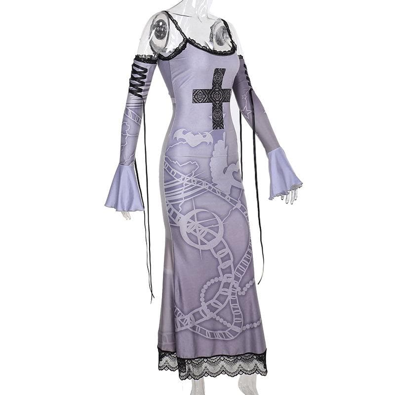 Long flared sleeve off shoulder cross print lace cami maxi dress