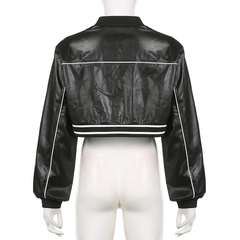 Long sleeve PU leather zip-up high neck coat top-final-sale