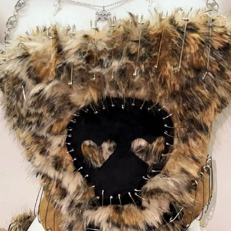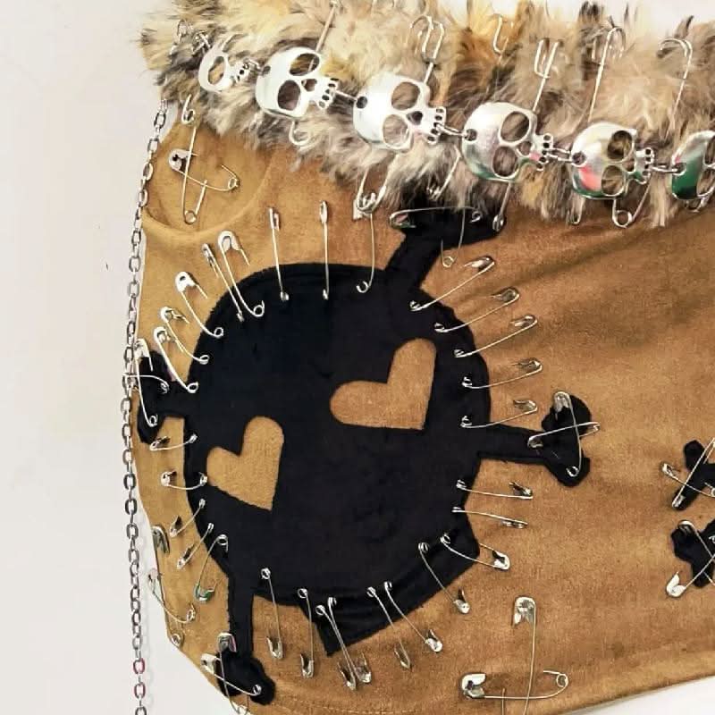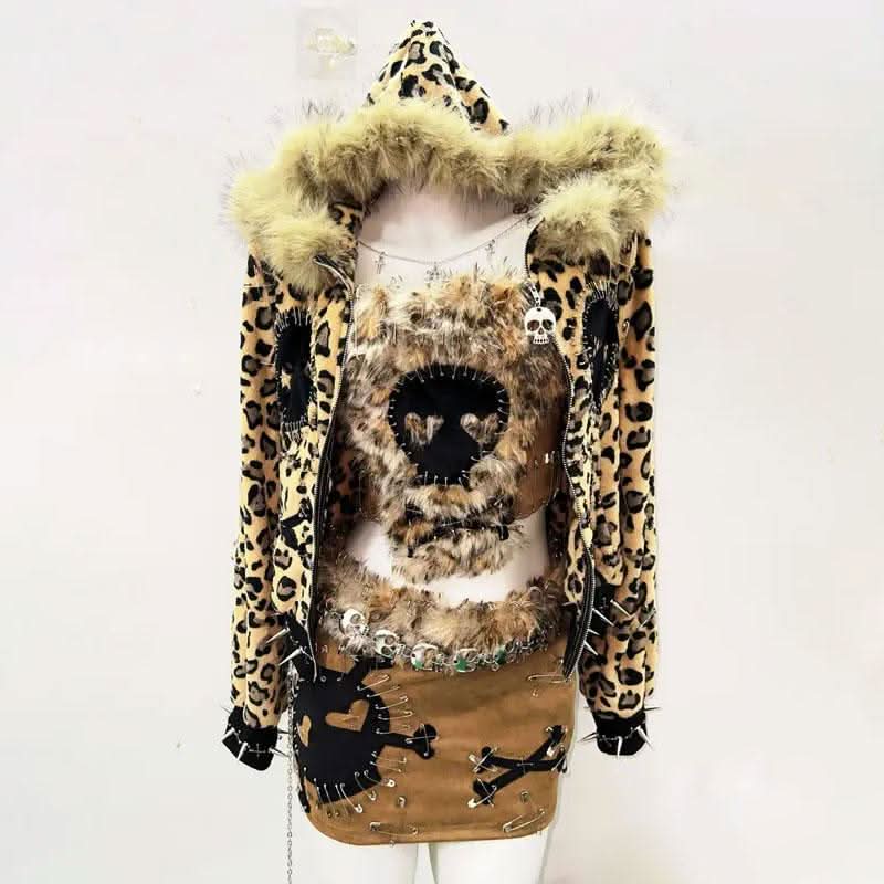 Long sleeve zip-up fluffy skull pattern mini skirt set