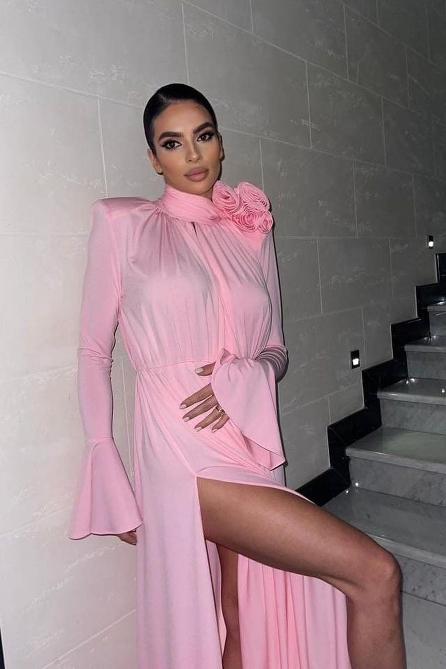 This luxury vintage gown features a deep V cut-out halter neckline that beautifully highlights the neck and shoulders. Exquisite pleating and draped fabric create a natural, flowing silhouette. 3D floral embellishments add artistic flair and depth. The maxi length elongates and slims, perfect for elegant dinners and formal events, allowing you to radiate timeless vintage elegance and confidence.