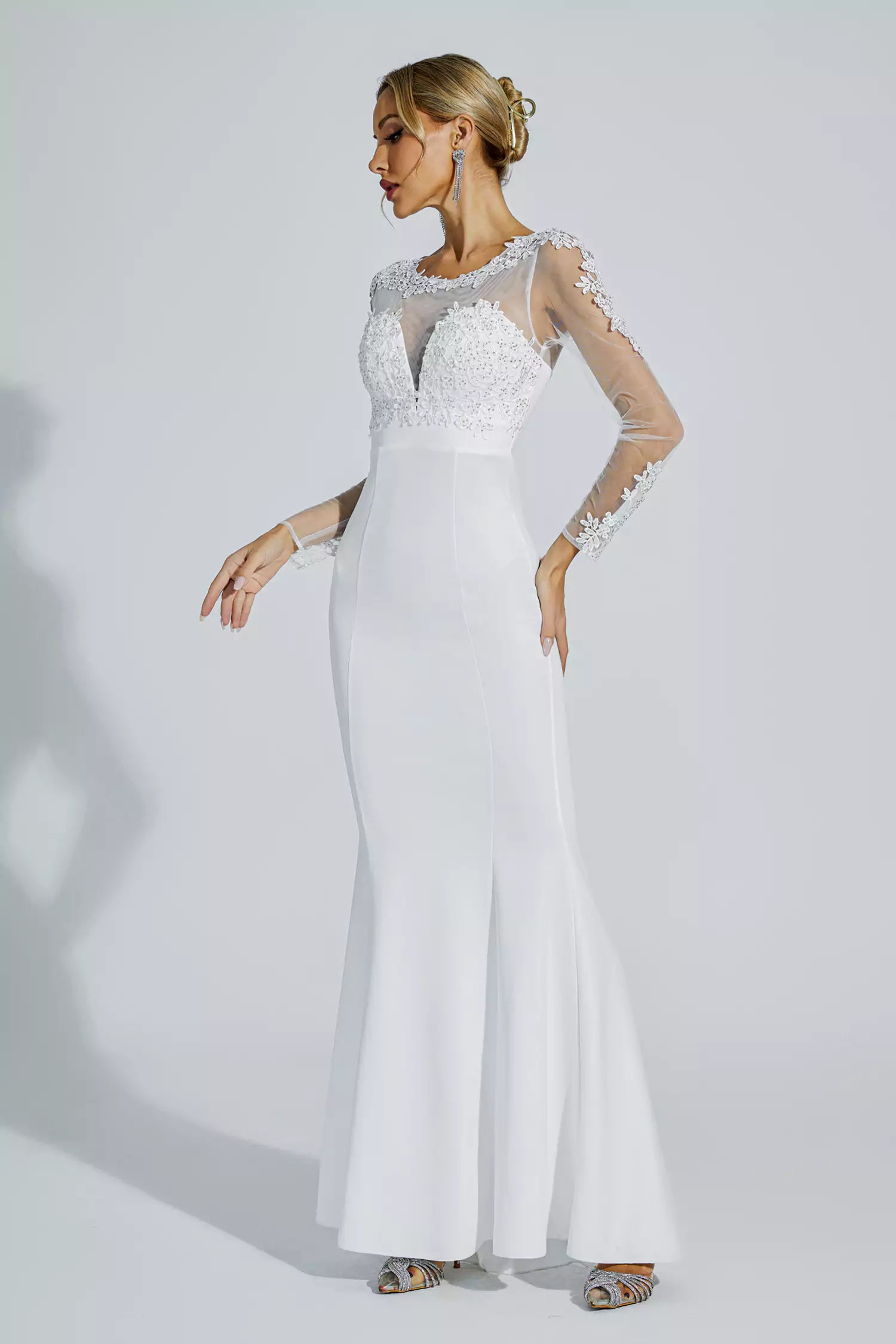 Elevate your elegance with the exquisite Madisyn White Lace Bodycon Maxi Dress. Handcrafted with satin lace, this stunning bridal-inspired evening dress features long sleeves and a fishtail hemline. Perfect for bridal occasions or formal evening events, its bodycon silhouette exudes sophistication and grace.