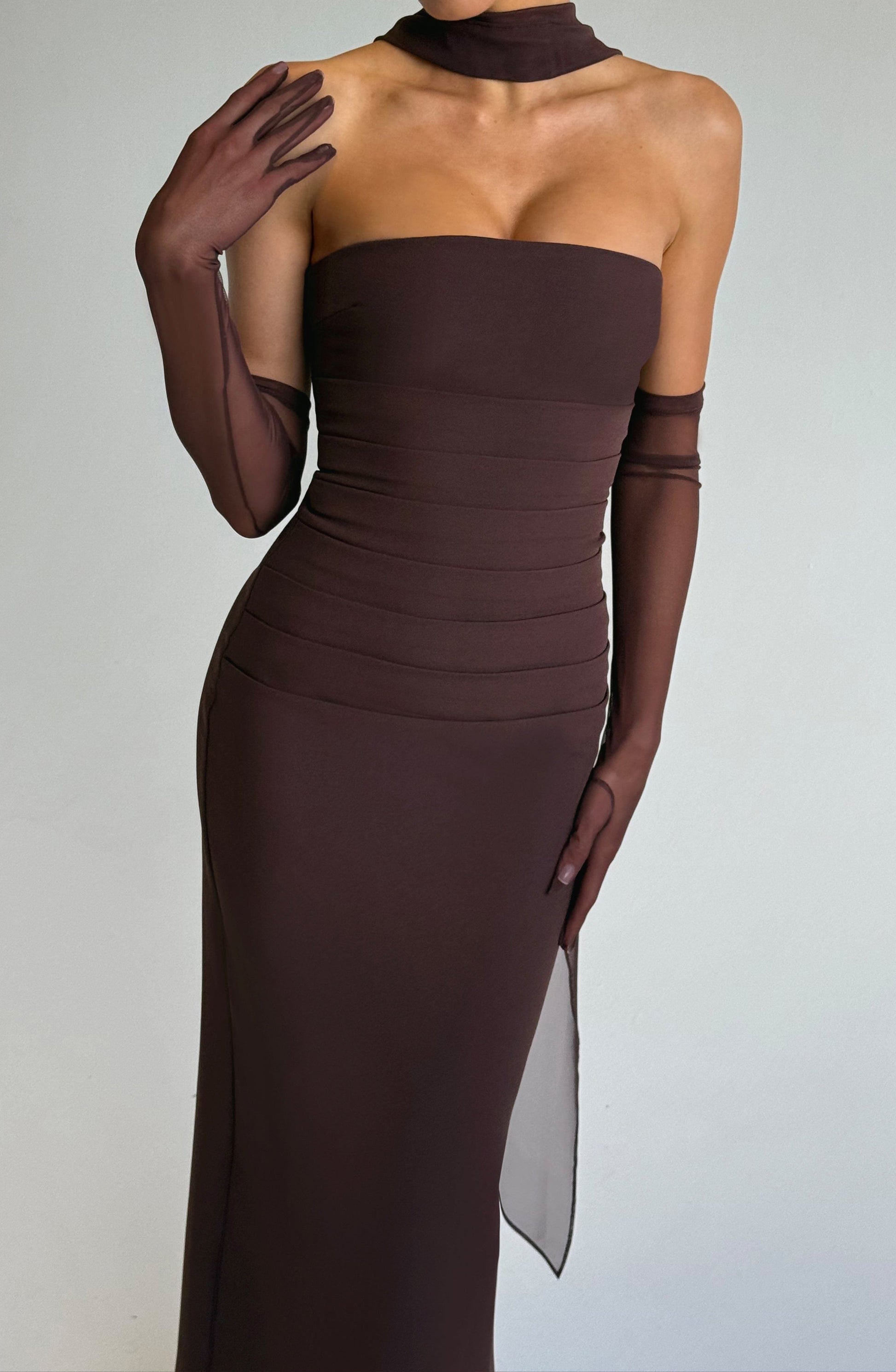 Command attention in this sophisticated plum brown maxi dress, where timeless elegance meets modern versatility. Expertly crafted from sleek non-stretch crepe, this strapless silhouette exudes refined glamour with its structured bodice and graceful column skirt.