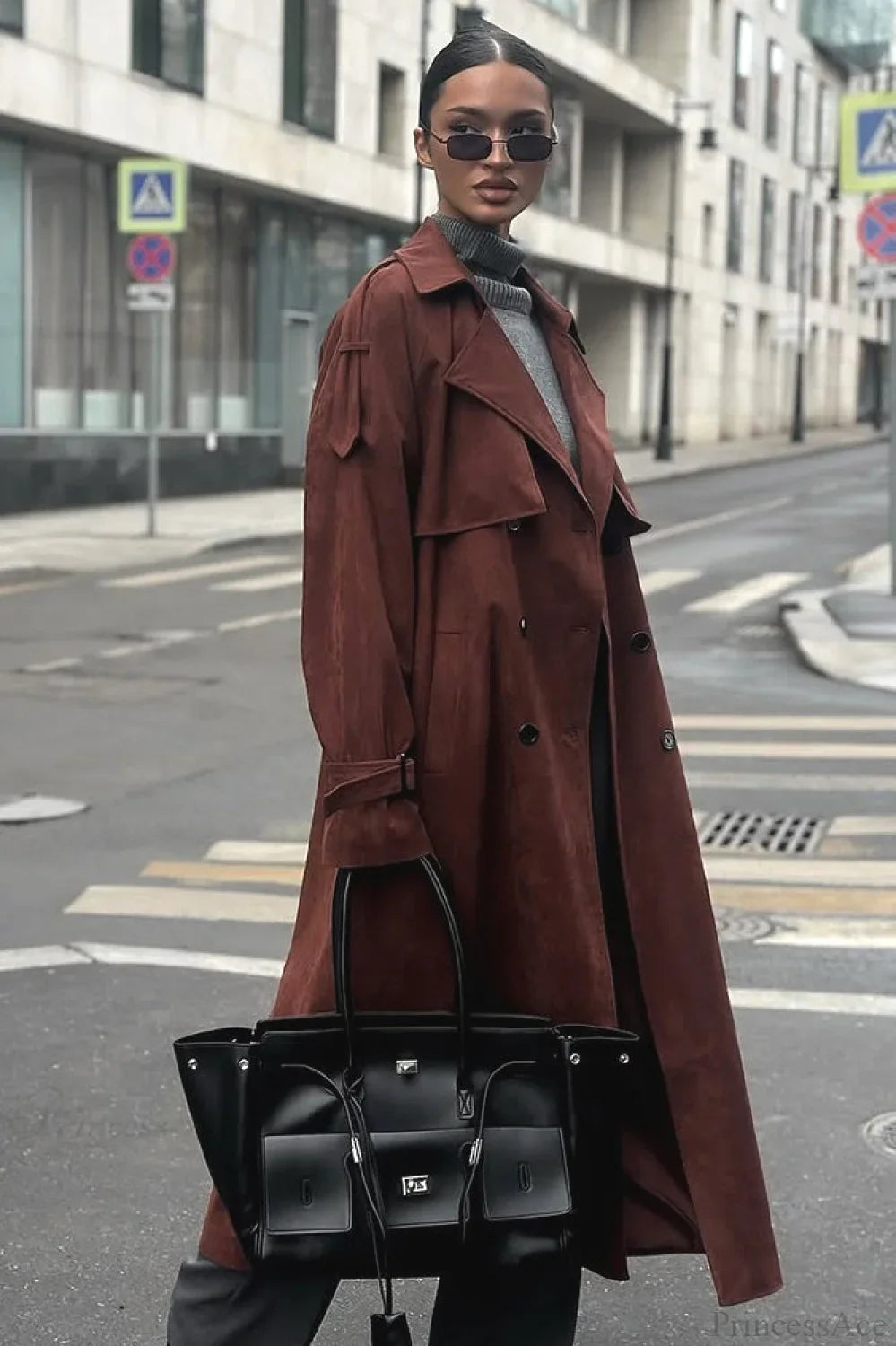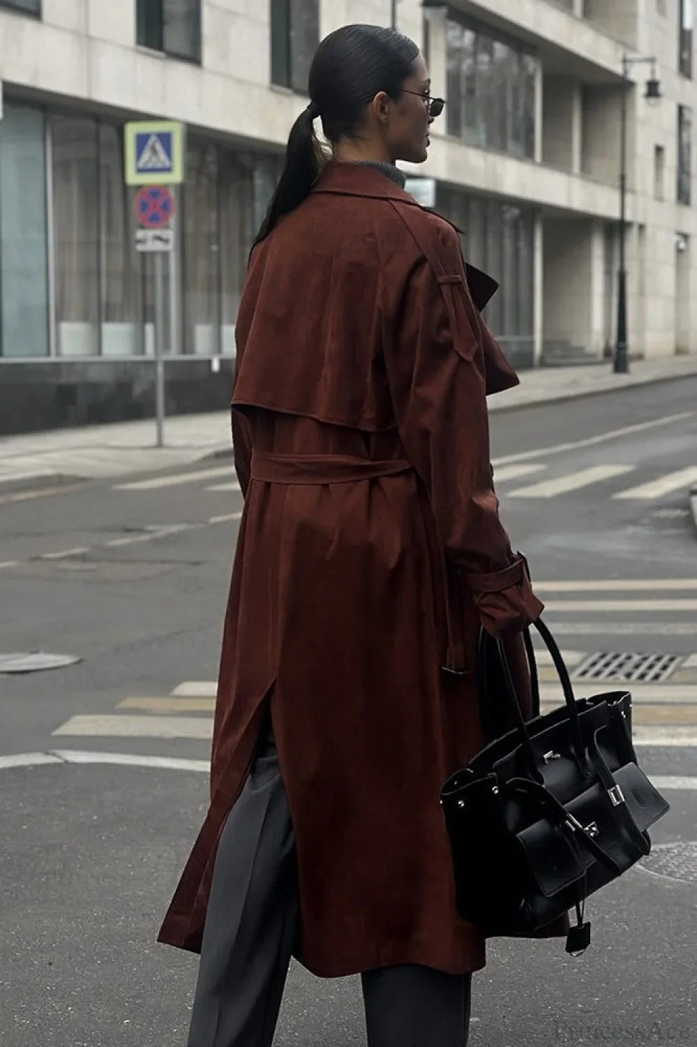 Vintage Maillard Notched Collar Suede Tie-Waist Overcoat