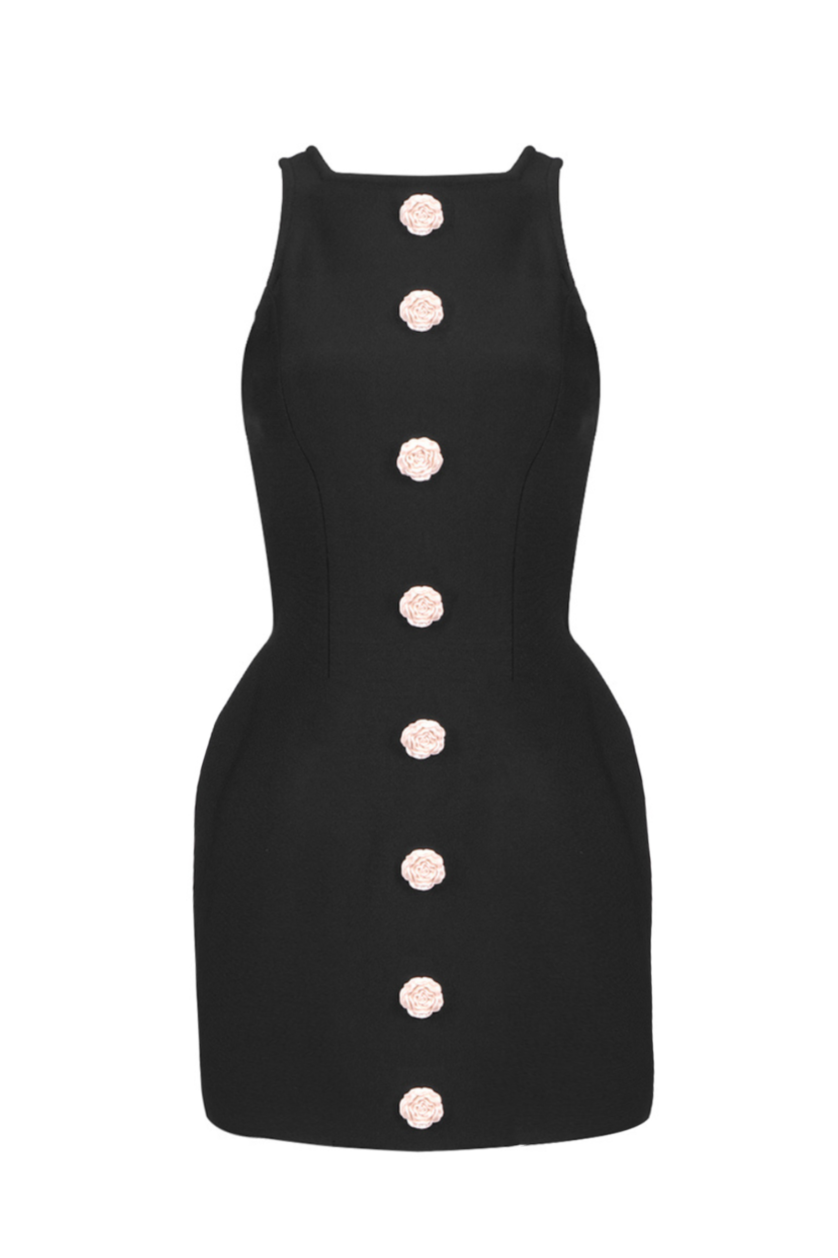 3D Flower Buttons At The Front, Hourglass Shape, Sleeveless, Mini Length.