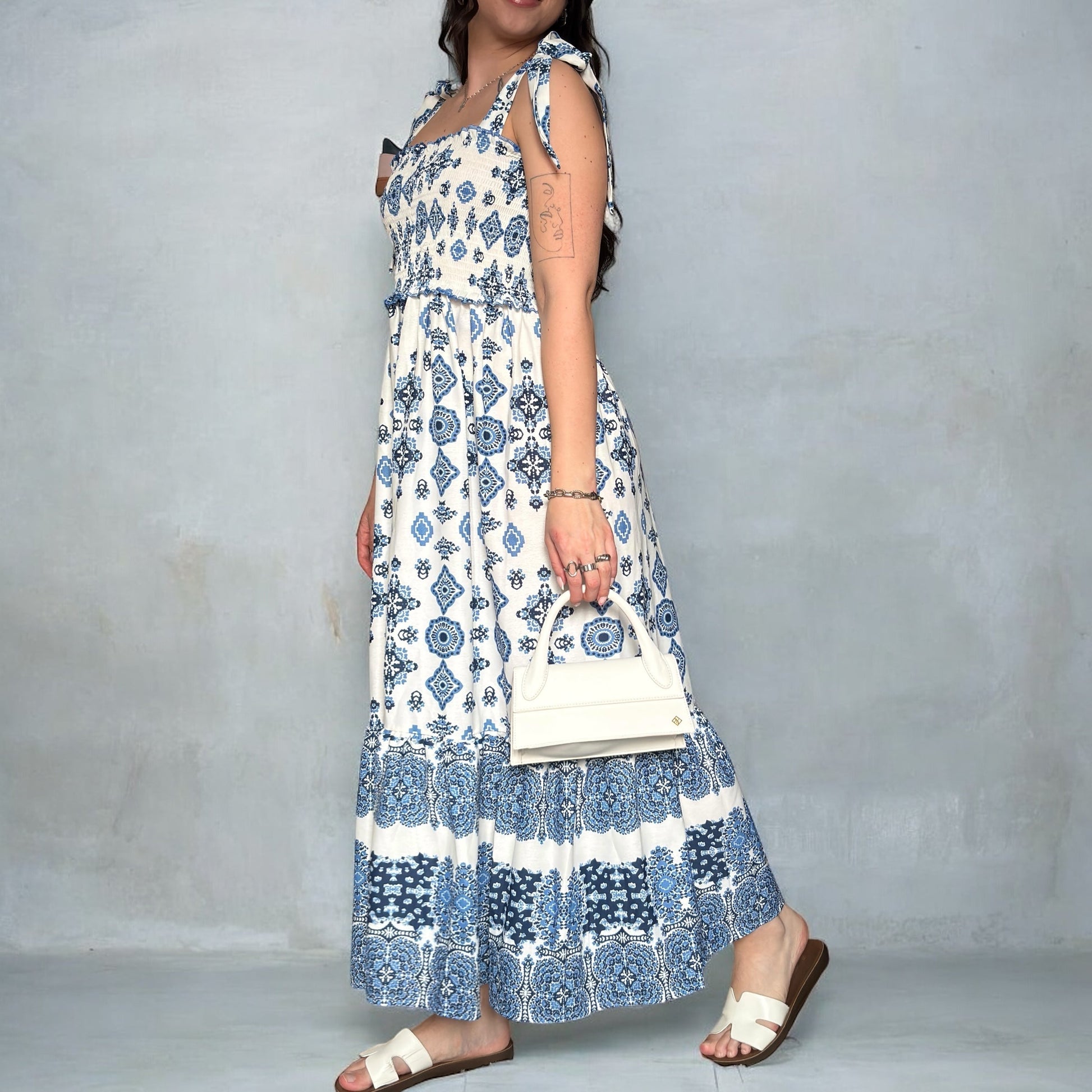 Timeless, but never boring—these intricate blue prints are equal parts classic and fresh. The soft hues and delicate patterns make it easy to style with anything. Whether you're headed to brunch, a picnic, or just twirling around the house because you feel cute, this dress is ready for all your best moments.