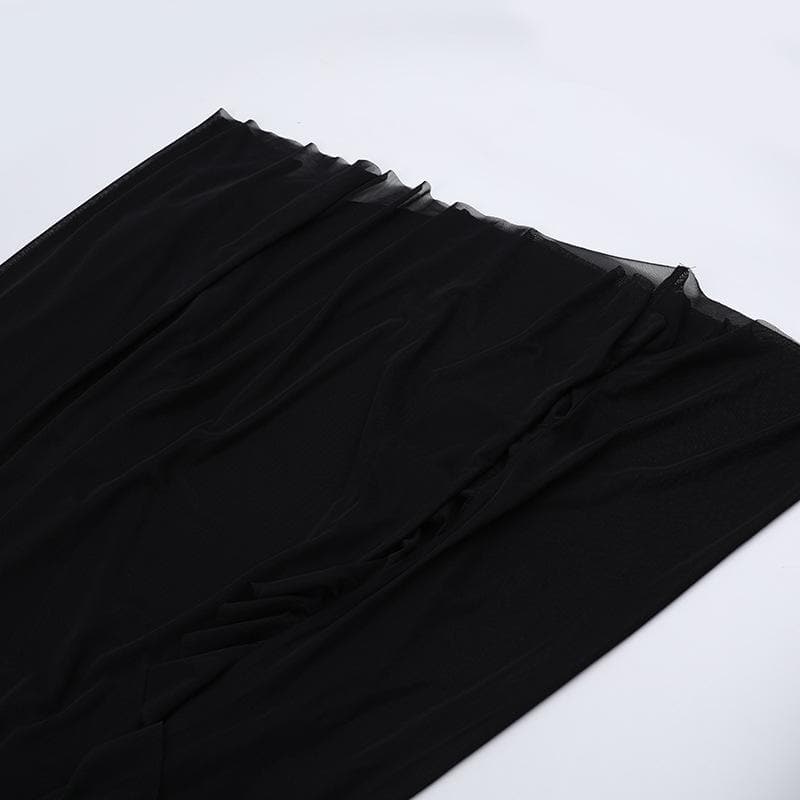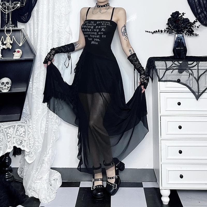 Mesh slit letter print ruffle cami maxi dress