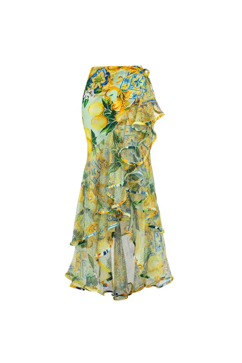 This fresh and vibrant swimsuit set includes two distinct one-piece styles inspired by Mediterranean summer charm. The first features a playful silhouette with cascading ruffles and a bright lemon print, exuding energy and femininity. The second offers a more refined look with a deep V-neckline and sheer mesh paneling, blending elegance with a touch of allure. Both designs are made from high-stretch, breathable fabric for a flattering and comfortable fit, perfect for beach getaways with a fashionable twist.