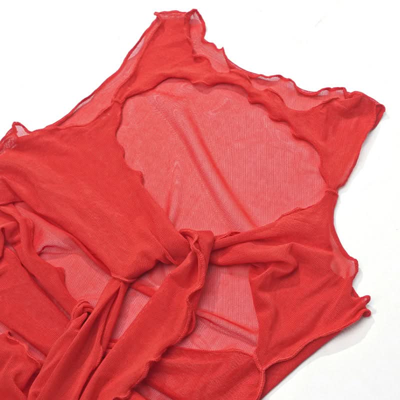 Mesh sleeveless hollow out slit knotted cut out maxi dress