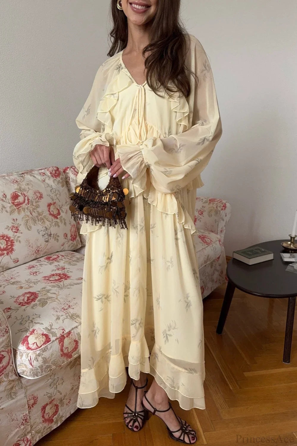Mesh V Neck Ruffled Fitted Maxi Dress
