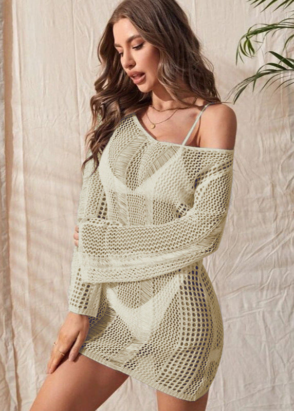 Midnight Waves - Crochet Beach Cover-Up brings effortless allure to your summer wardrobe. Designed with an intricate open-knit pattern, this lightweight cover-up drapes beautifully over swimwear, offering a semi-sheer, breezy feel. The off-shoulder neckline and long sleeves create a relaxed yet sophisticated silhouette, perfect for lounging by the beach or poolside. Layer it over your favorite swimsuit for a stylish transition from sunbathing to sunset drinks.