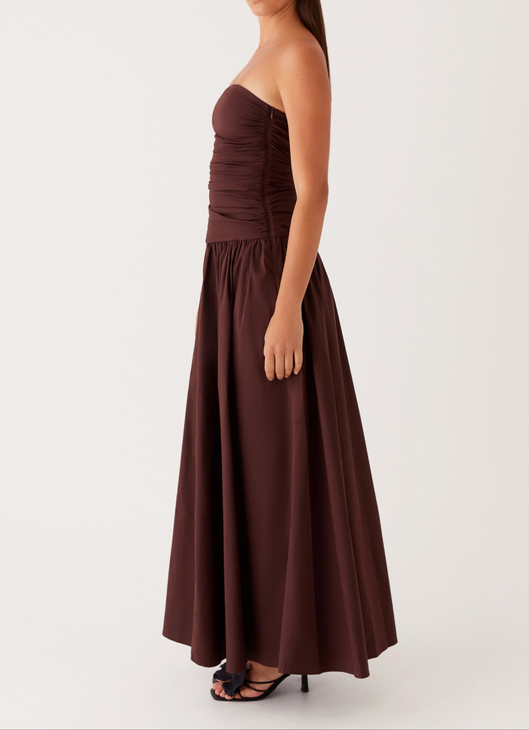 Effortlessly elegant and designed for sophistication, this strapless maxi dress features a beautifully ruched bodice and flowing A-line silhouette. The classic ivory hue and full skirt create a dreamy, feminine look perfect for weddings, garden parties, or any special occasion.