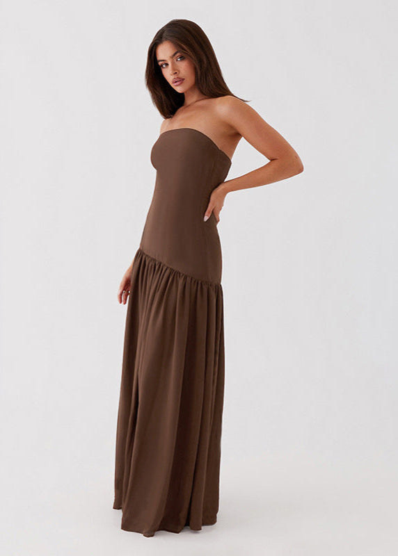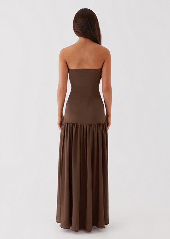 Mocha Drape – Strapless High Slit Maxi Dress combines bold simplicity with fluid movement. This strapless silhouette hugs the upper body with a smooth, fitted design and flows into a gathered full-length skirt with a dramatic high slit. The rich mocha tone adds depth and warmth, while the breezy fabric offers softness and freedom. Ideal for summer nights, special occasions, or rooftop dinners, it brings balance between structure and effortless drape.
