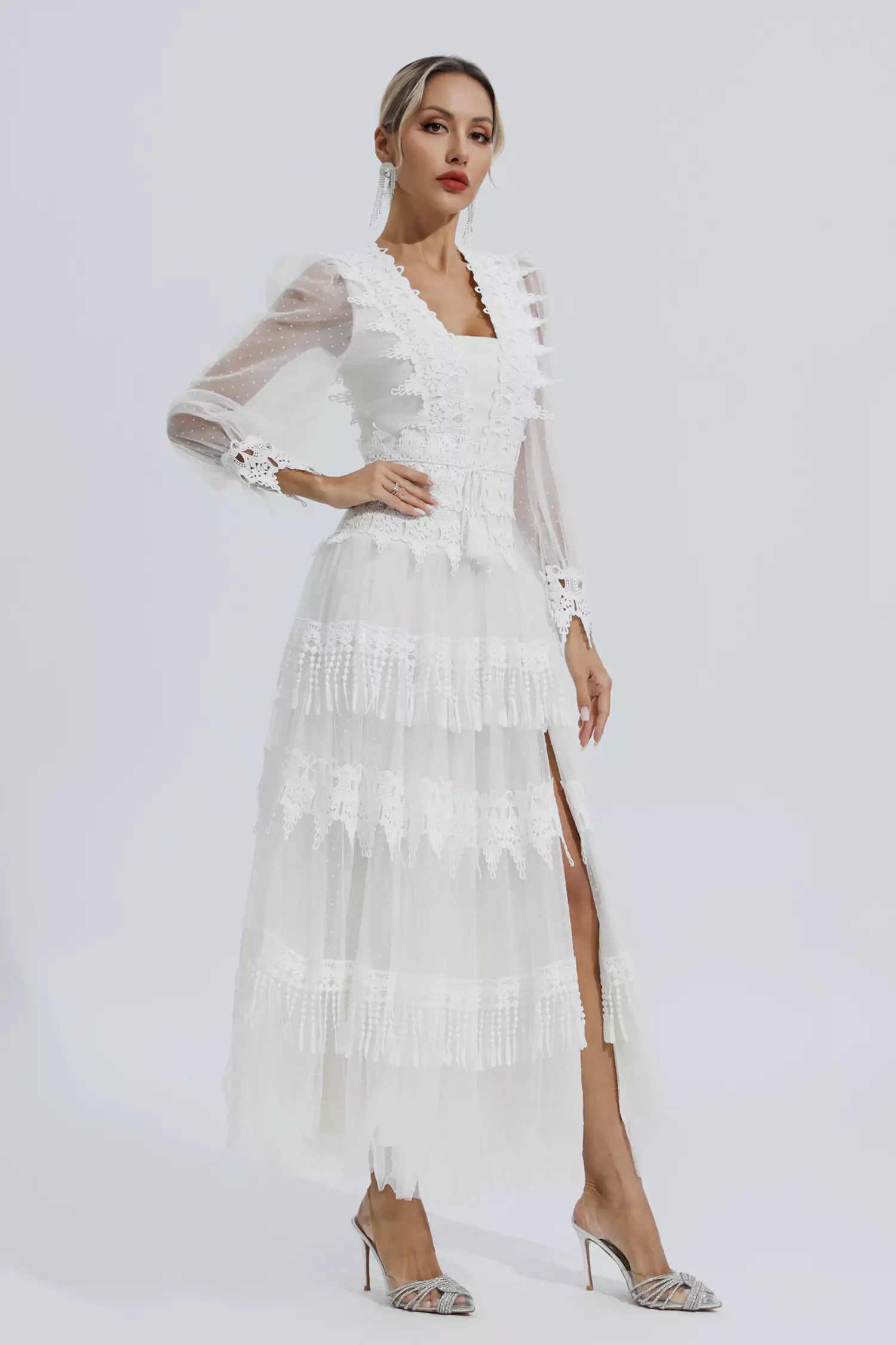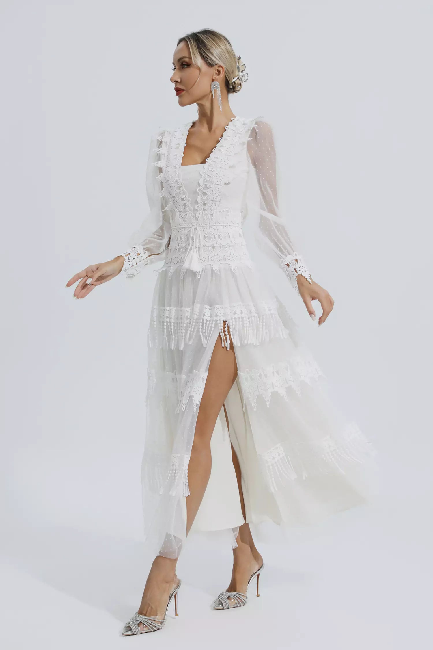 Elevate your style with the Murphy White Lace Mesh Maxi Dress. This stunning dress features a sexy V-neckline, intricate lace detailing, and a high leg slit. Perfect for special occasions or office chic. The lightweight mesh fabric adds a touch of allure, making it an ideal choice for a graceful look