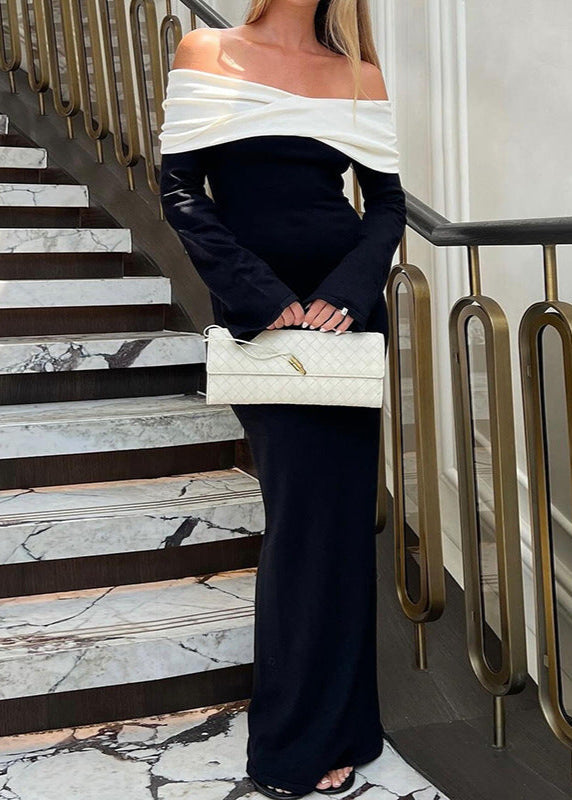 Noir Elegance - Off-Shoulder Contrast Maxi Dress