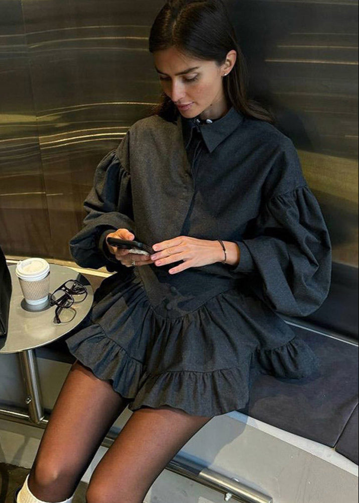 Noir Opulence - Ruffled Mini Skirt Set redefines modern elegance with its structured yet feminine design. The oversized button-up shirt features dramatic balloon sleeves for a bold statement, while the high-waisted ruffle mini skirt creates a striking contrast. Crafted from a soft, structured fabric, this set offers a sophisticated monochrome look perfect for evening outings, upscale casual wear, or pairing with boots for a chic, city-ready ensemble.