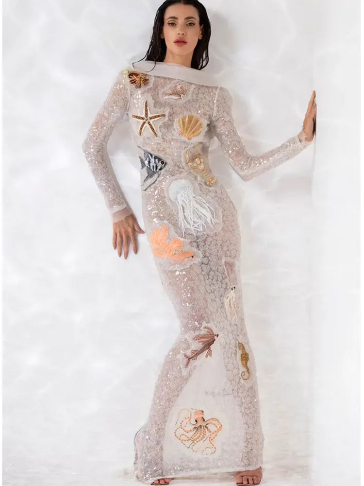The Nora Maxi Dress is perfect for any summer occasion. With a mesh perspective design, this elegant dress features long sleeves and a tight fit that will make you stand out in a crowd. The open back adds a sexy touch, while the sequins and starfish detailing add a touch of glamour. Perfect for any banquet or party, the Nora Maxi Dress is a must-have for your wardrobe this season.