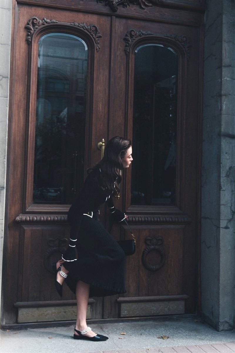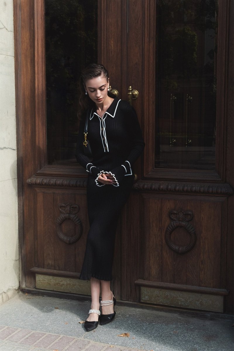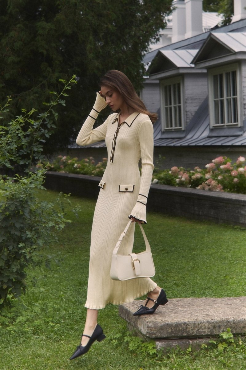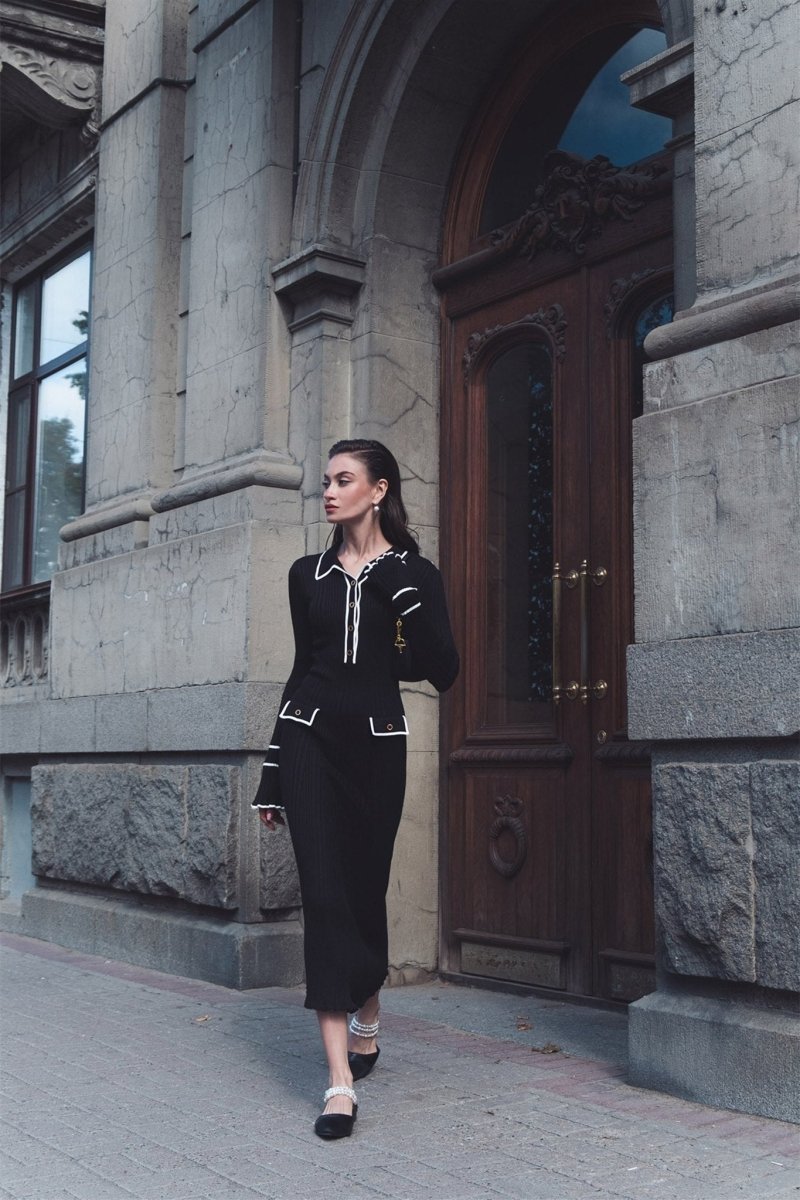 - Fitted Silhouette, Polo Collar, Long Sleeves, Imitation Side Pockets, Contrast Edging, Maxi Length.