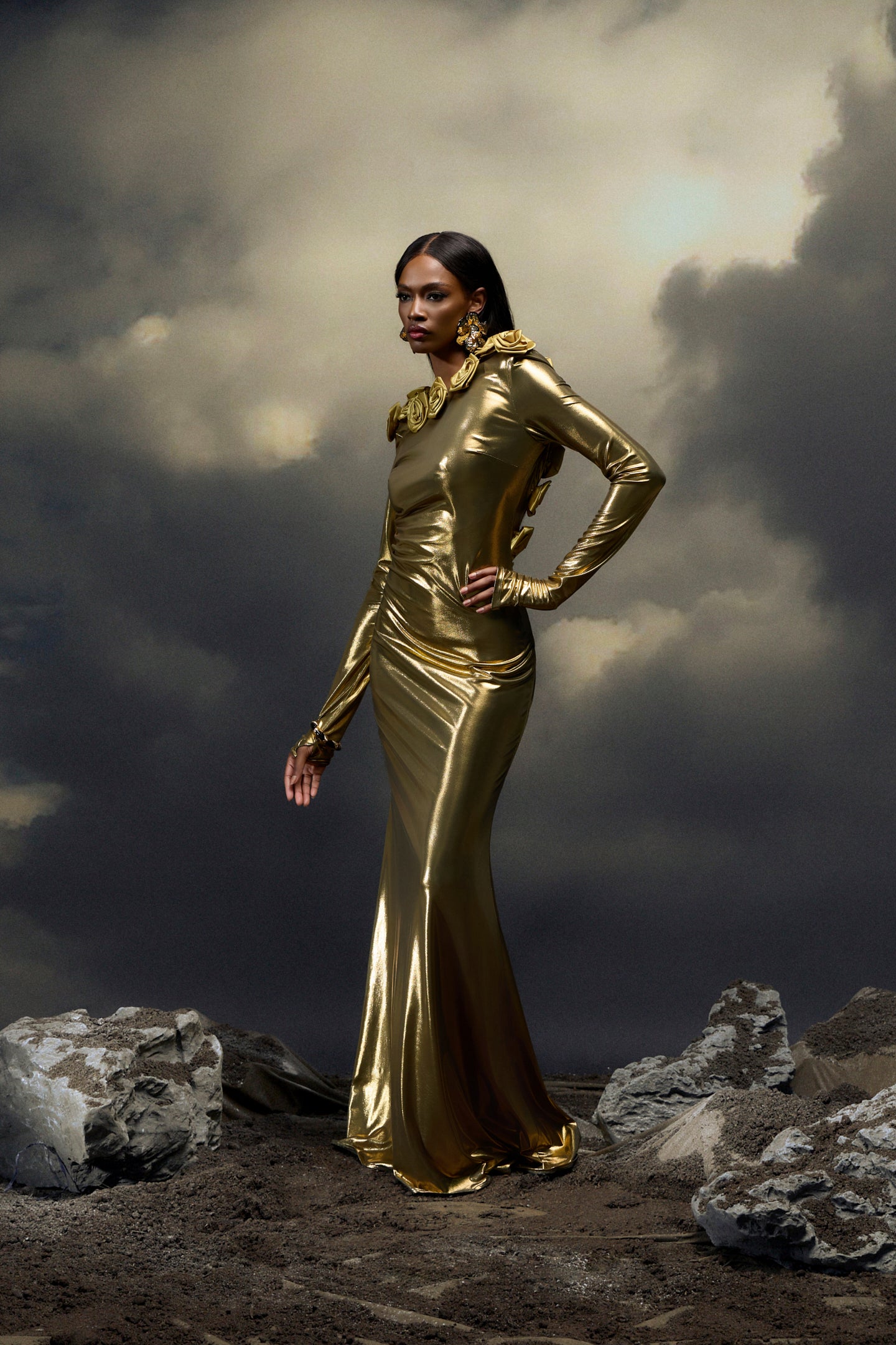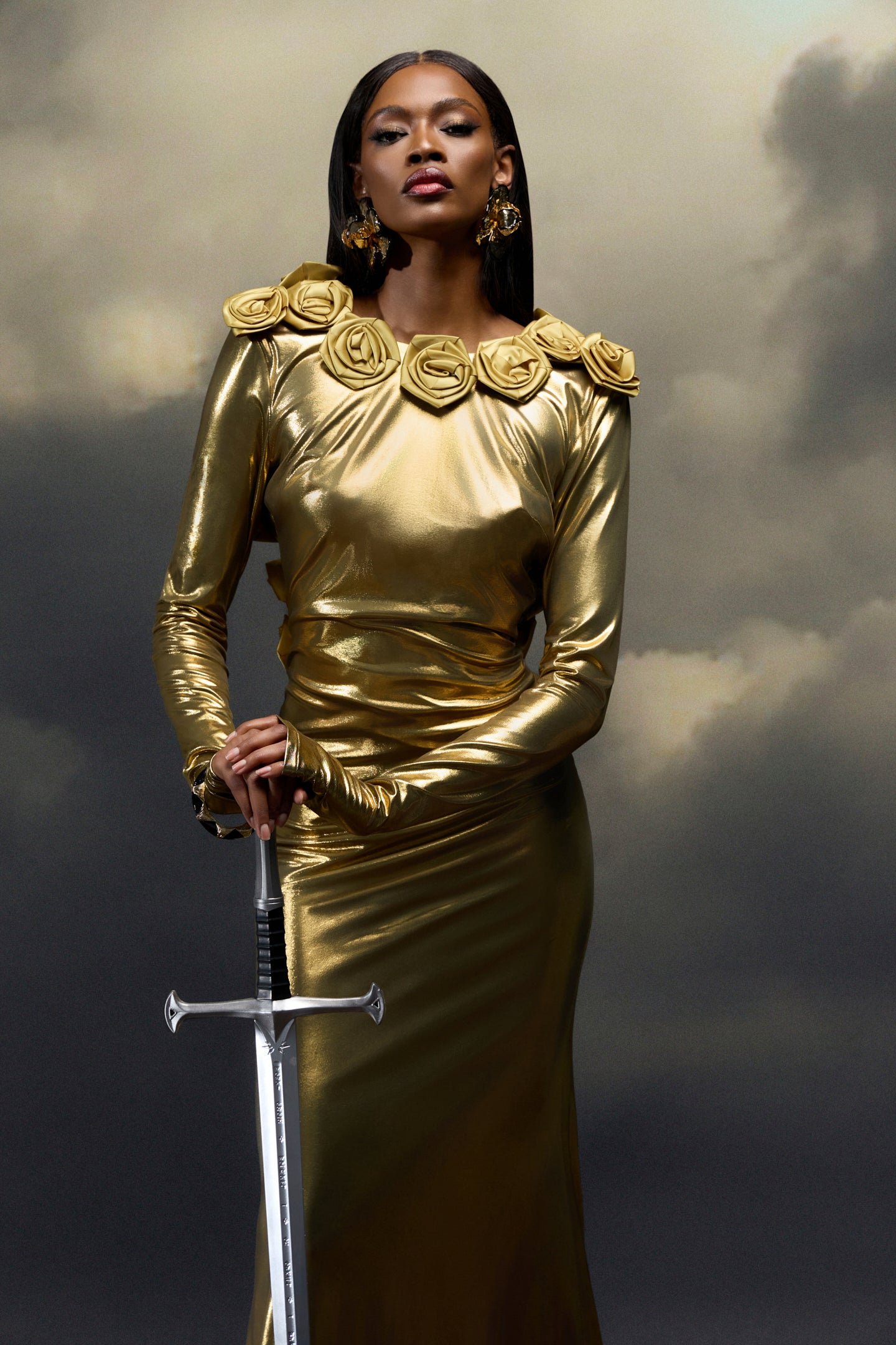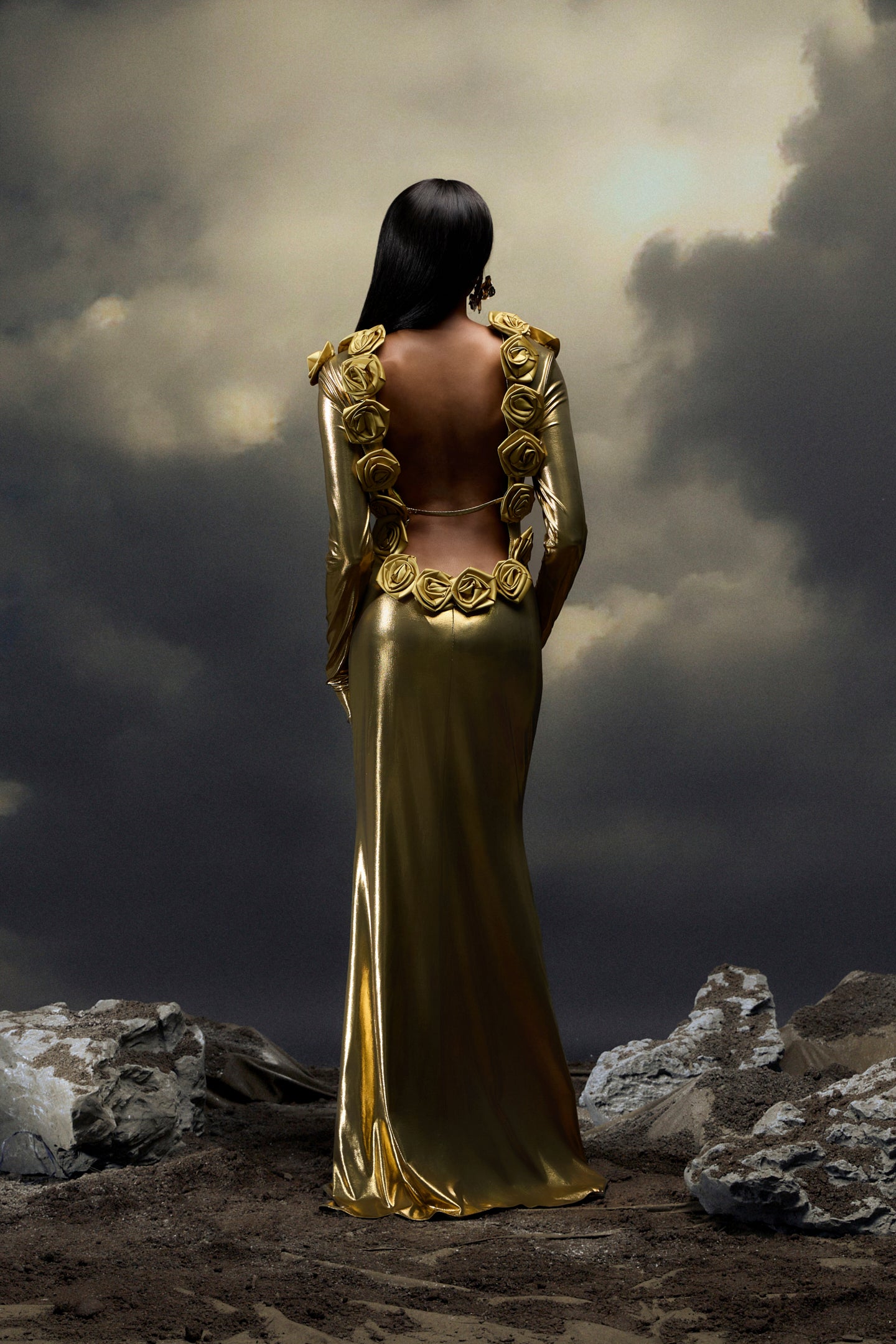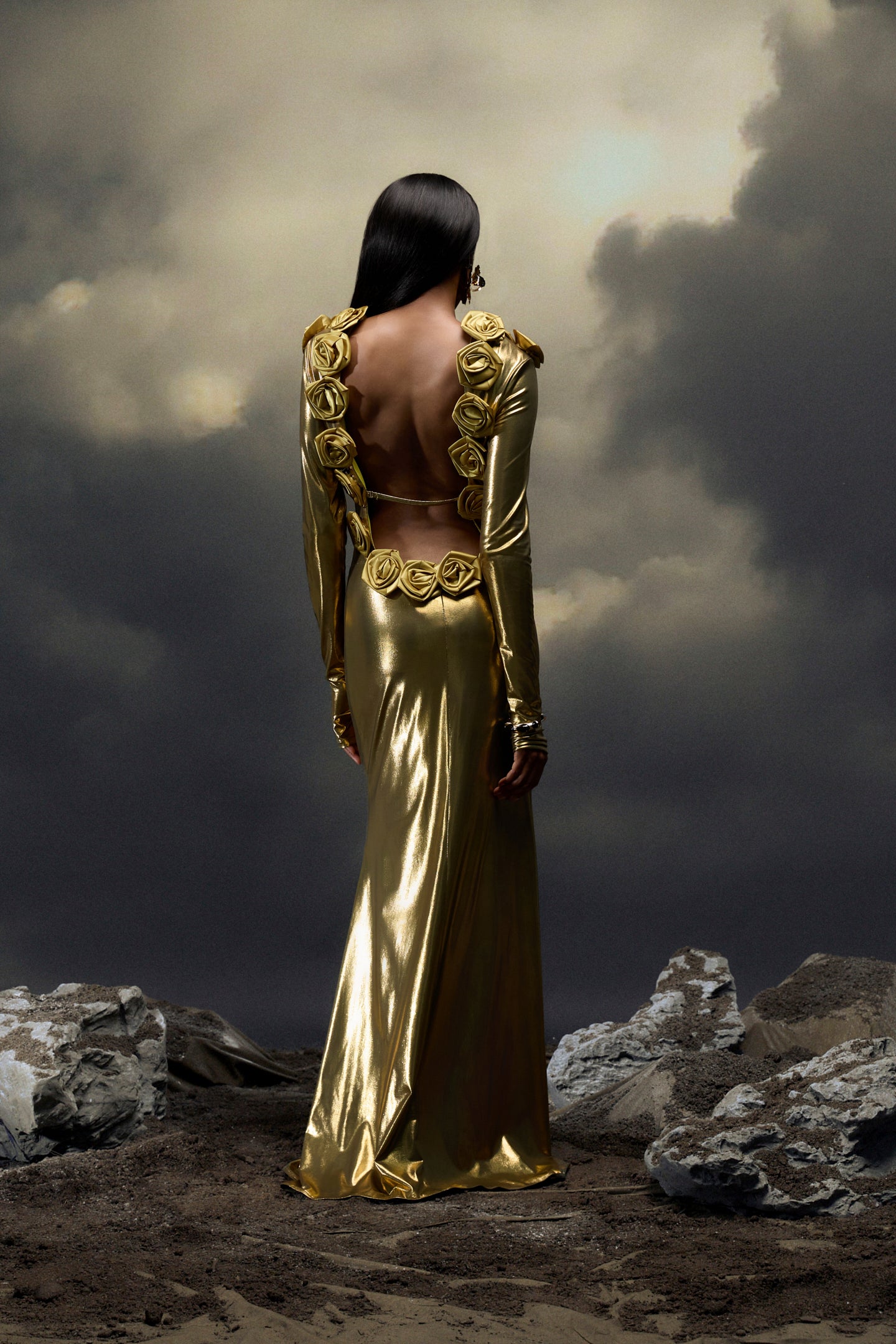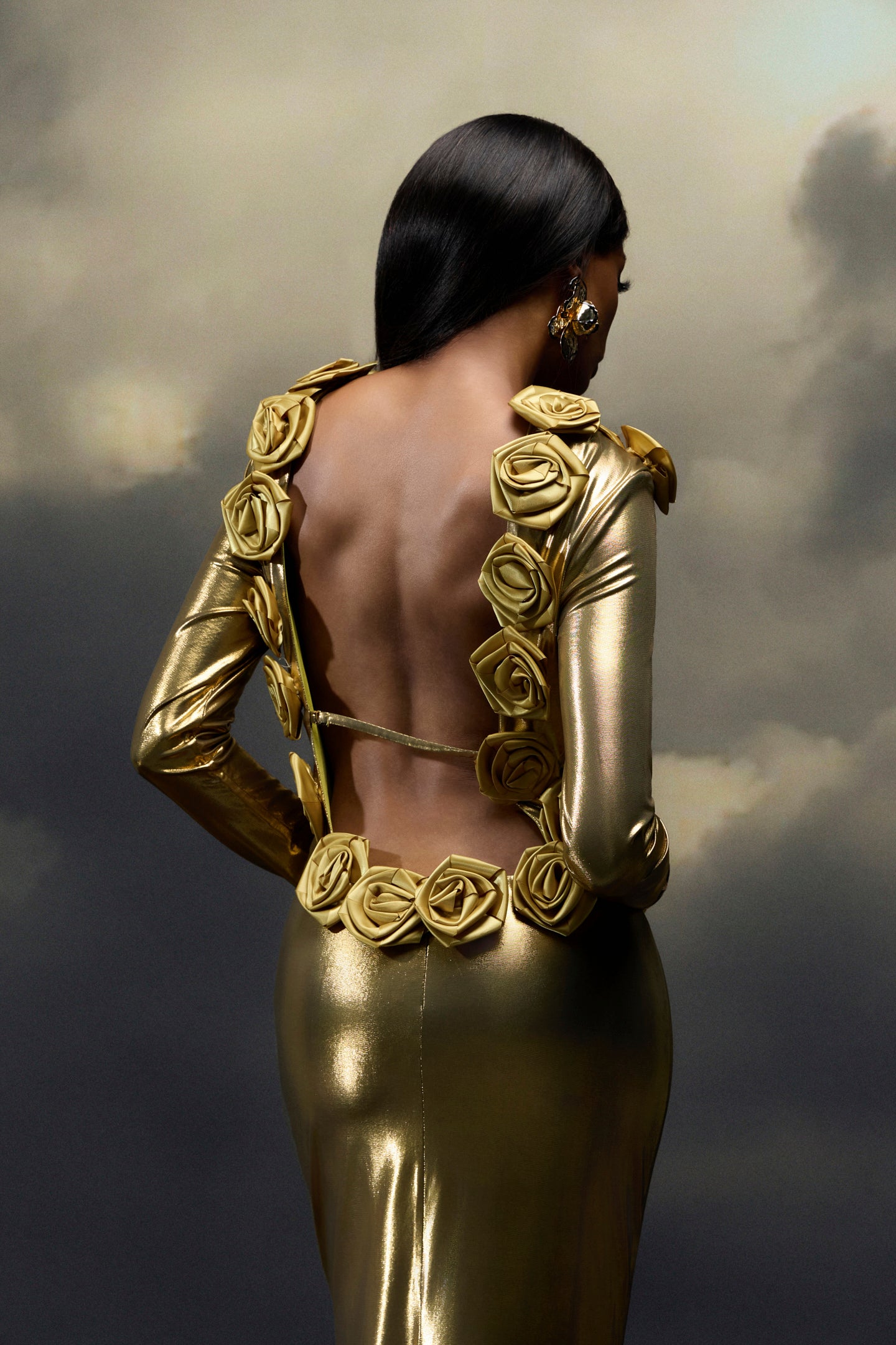 Long Sleeve, Round Neck, Floral Applique, Backless, Maxi Length.
