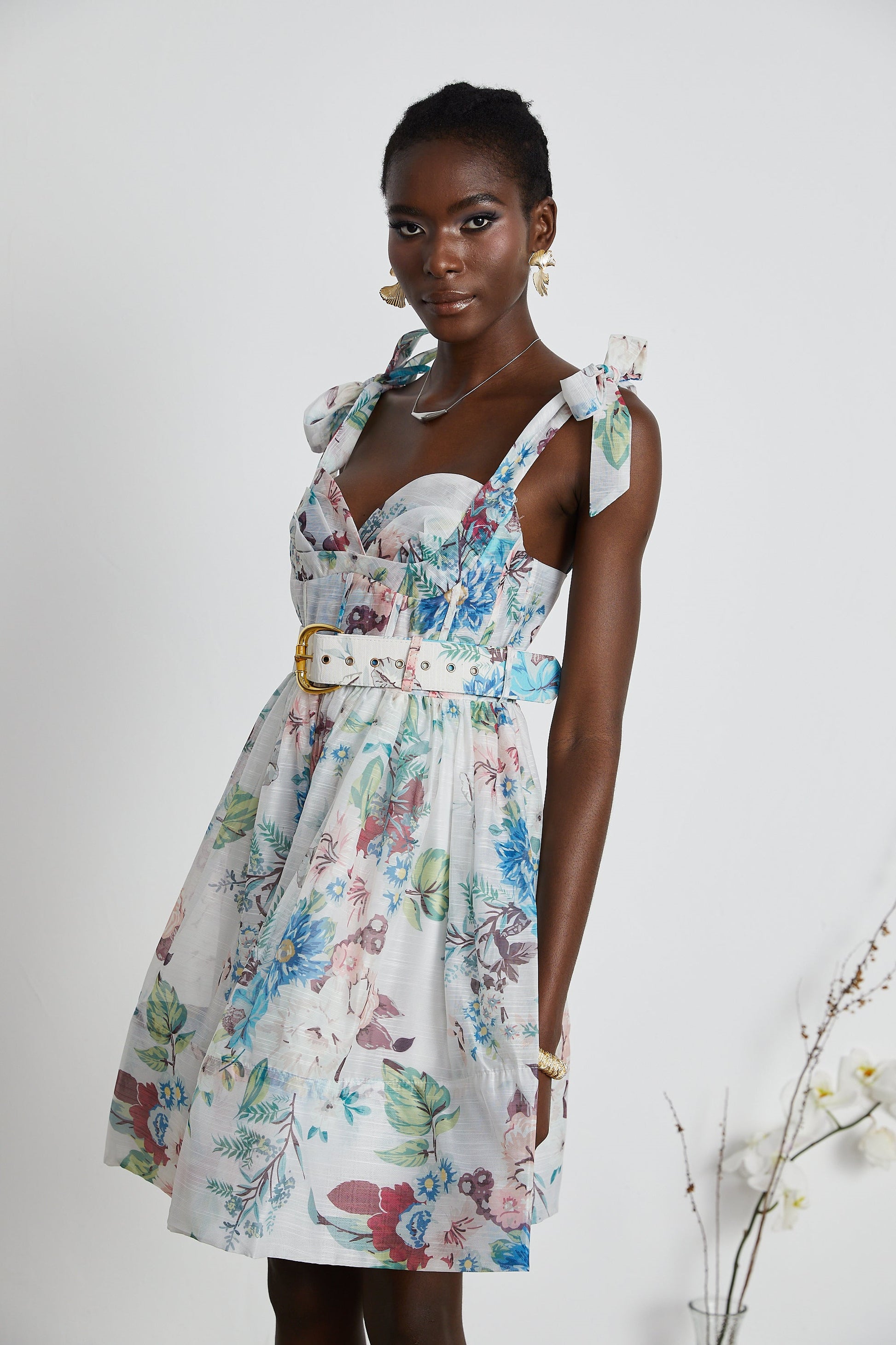 - Ivory Barkcloth Print, Shirred Back, Pockets In Side Seam, Removable Belt, Mini Length.