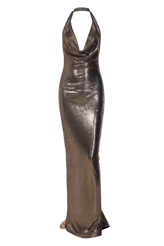 This dazzling floor-length dress is crafted from high-shine metallic fabric, featuring a deep V-neck and a backless design for a bold, glamorous look. Made from a blend of polyester and spandex, it offers a flattering fit with high stretch for comfortable movement.