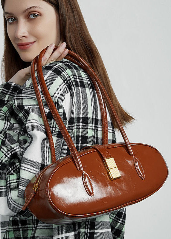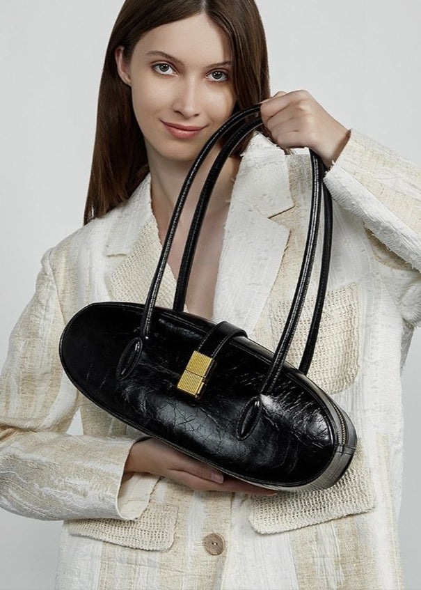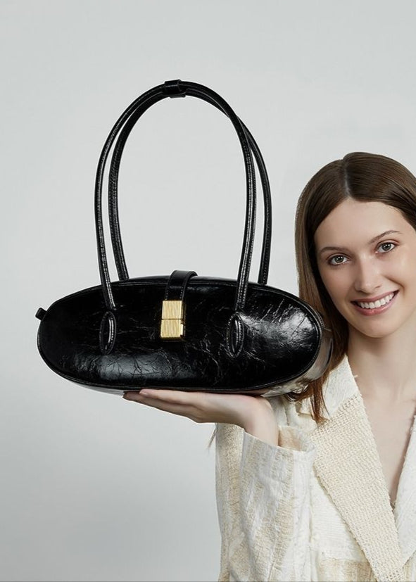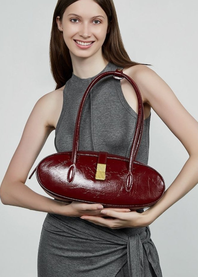 The Oval Patent Leather Top Handle Bag is a sleek statement piece designed for both style and practicality. Crafted from high-quality patent leather, it features a unique oval silhouette that stands out effortlessly. Measuring 36 cm (14.17 in) in length, 14 cm (5.51 in) in width, and 26 cm (10.24 in) in height, it offers enough space for your phone, wallet, cosmetics, and small essentials. The structured design maintains its shape, while the dual top handles provide a comfortable grip. A secure clasp closure adds a refined touch, making this bag perfect for dinners, special occasions, or elevating your daily outfits.