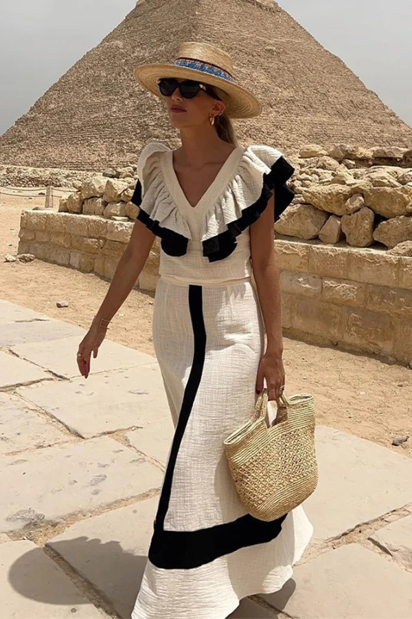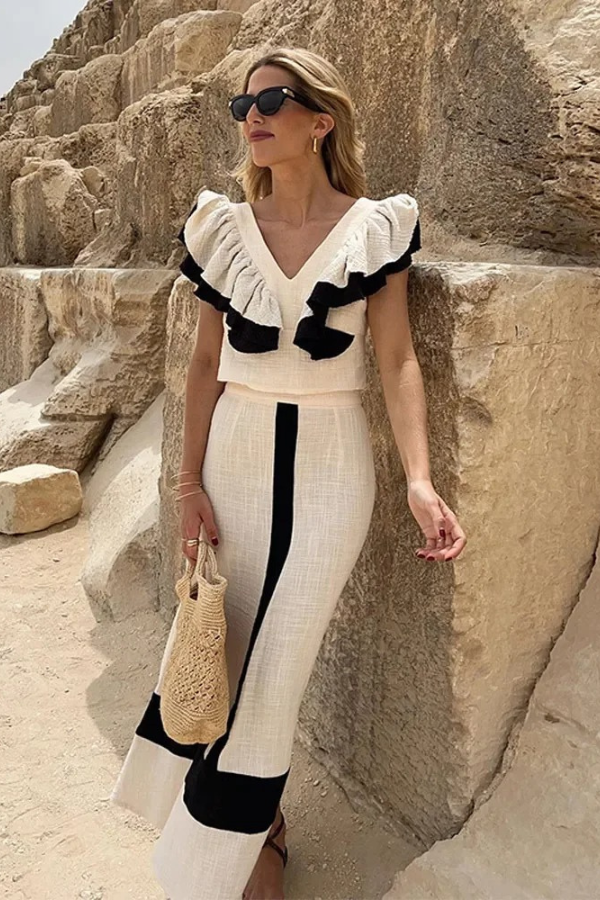 Embrace effortless elegance with this Elegant Women's High-Waist Midi Skirt Set, perfect for your summer vacation wardrobe. Featuring a chic ruffled short suit with a flattering bare back design, this ensemble exudes a playful yet sophisticated vibe. The patchwork V-neck top adds a touch of modern flair, while the high-waisted midi skirt creates a streamlined silhouette, offering both comfort and style. Whether you're strolling along the beach, enjoying a rooftop dinner, or exploring a new city, this set is designed to turn heads with its perfect balance of femininity and trendsetting style.