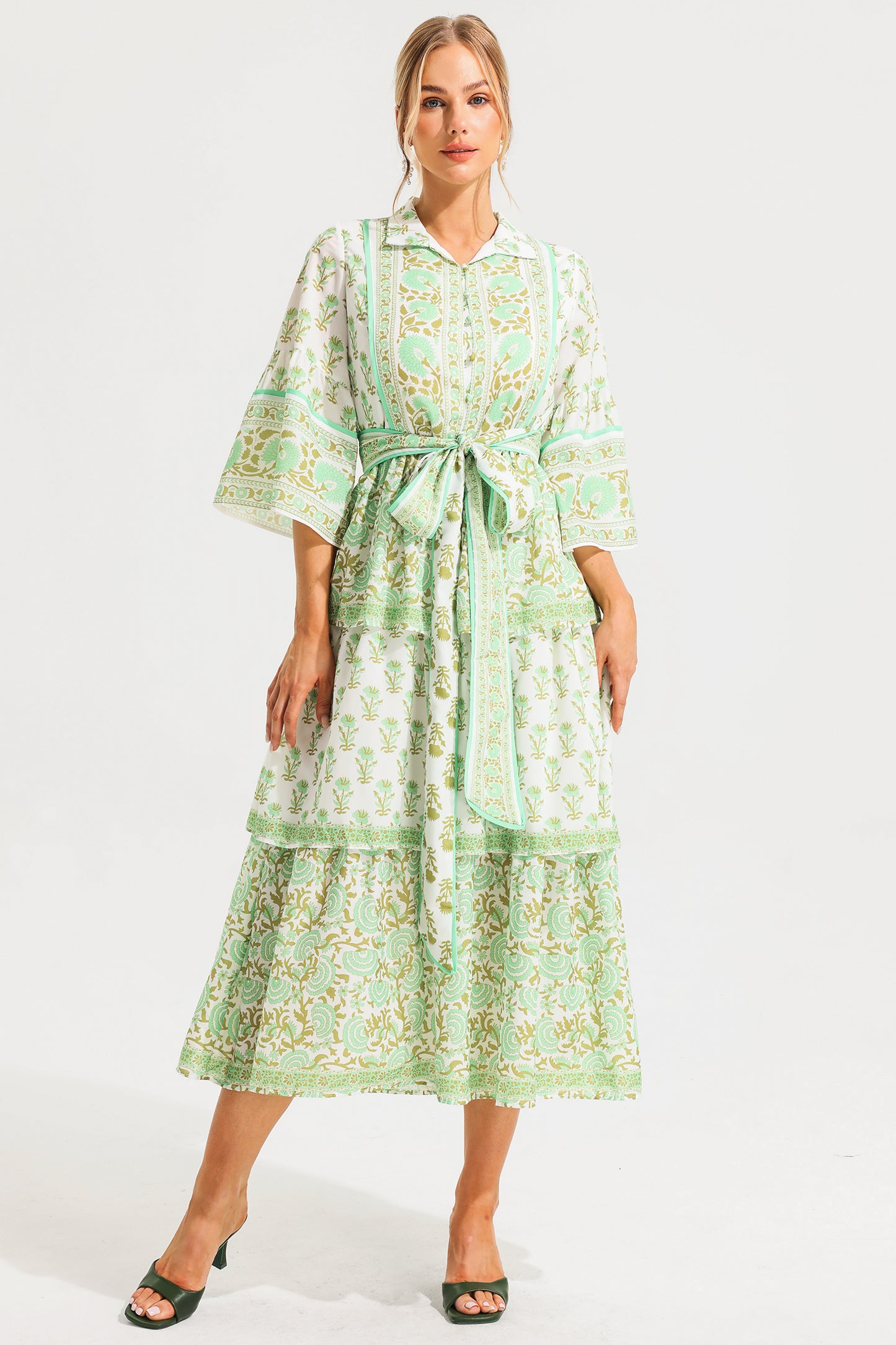- Paisley, single -breasted, tiered hem, mid sleeve