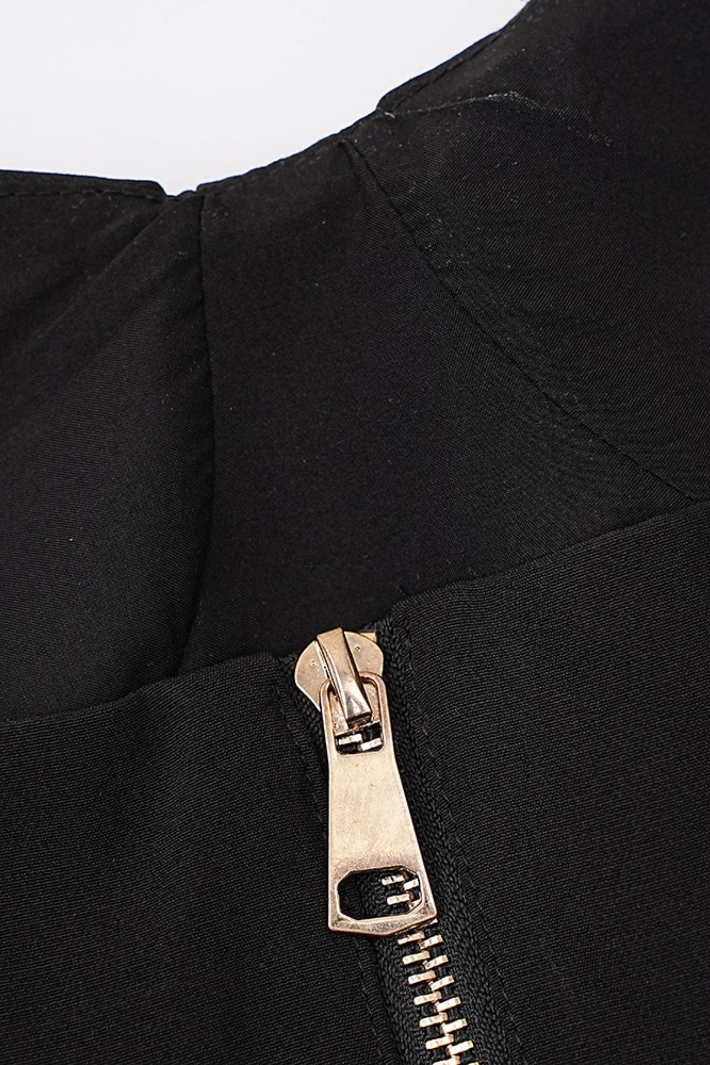 - Opening: A metal zipper is at the center back with snap buttons at the neck.