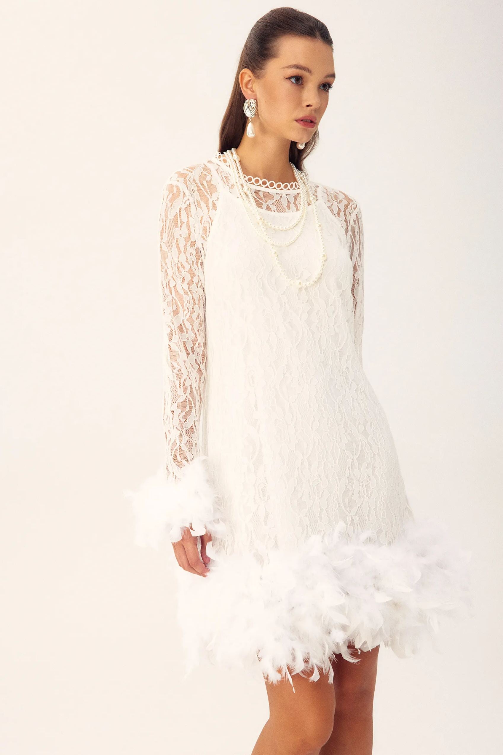 - Long Sleeves, Round Neck, Semi-sheer Design, Lace Detailing, Feather-trim Detailing, Mini Length.