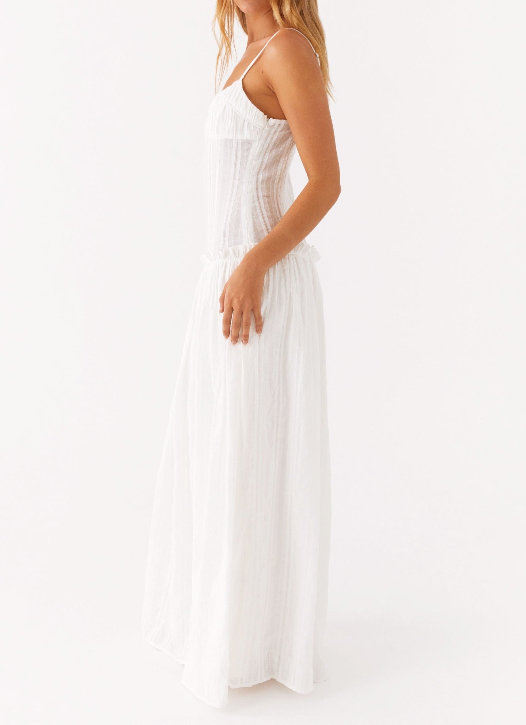 Channel romantic summer elegance in this flowy drop waist maxi dress, designed to flatter your figure with delicate detailing and an effortlessly chic silhouette. With its open back and ruched bustier, it’s the perfect piece for garden parties, date nights, or beachside dinners.