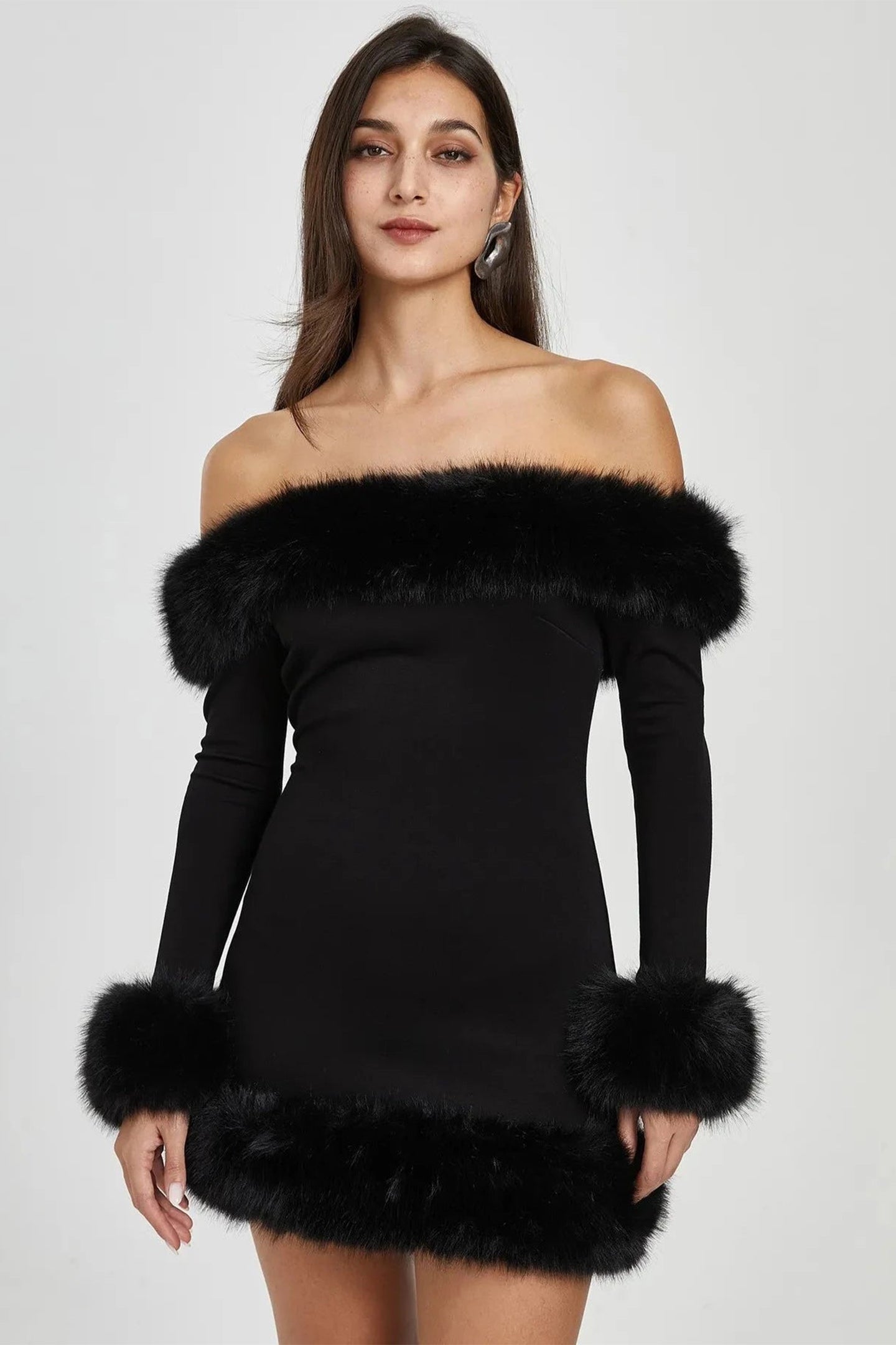Off Shoulder, Fur Trim Detail, Long Sleeves, Straight Hem, Mini Length.