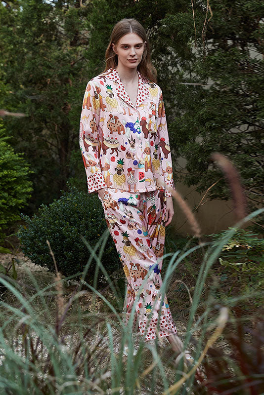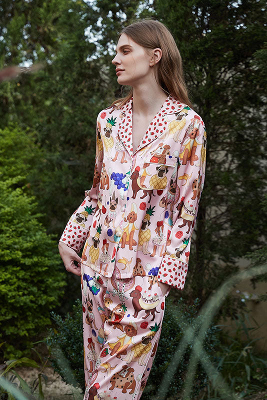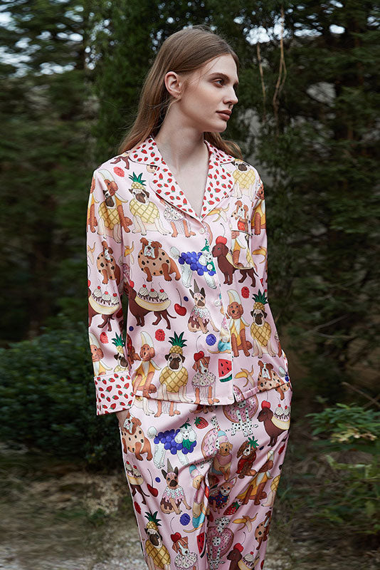 Sweeten your dreams with the Pink Dessert Dog Pajama Set, a fun and cozy treat for both dog lovers and dessert enthusiasts! Featuring an adorable print of playful pups surrounded by delicious desserts, this set adds a whimsical touch to your loungewear collection. Made from soft, breathable fabric, it’s designed for ultimate comfort, perfect for those lazy mornings or cozy evenings at home.