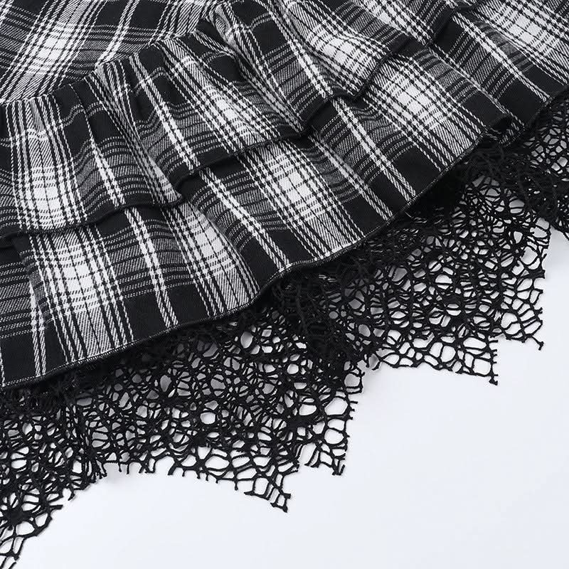 Plaid ruched hollow out buckle A line cut out mini skirt