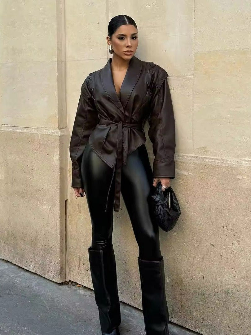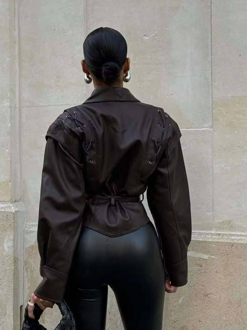 PU Leather Lace-up Lapel Collar Blazer Jacket