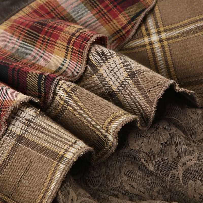 PU leather plaid patchwork belt lace hem mini skirt