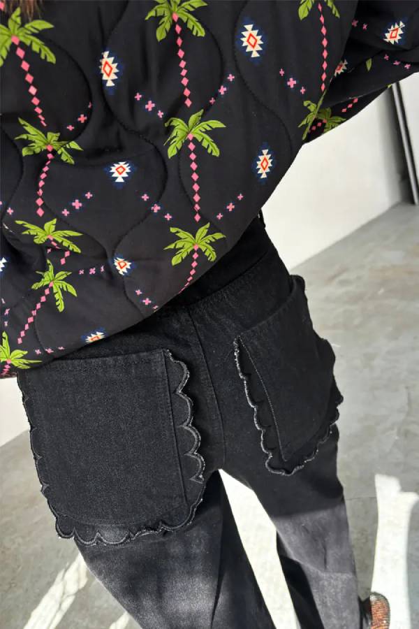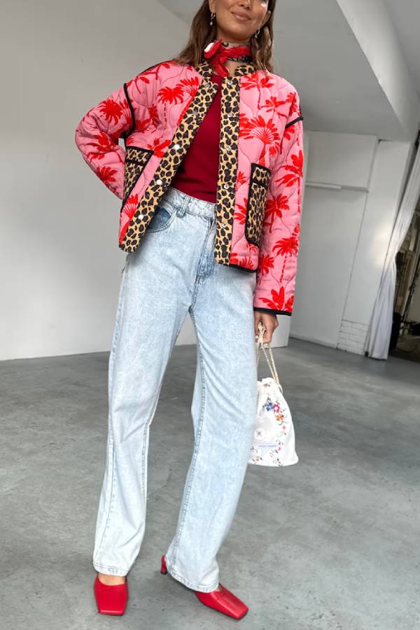Two gorgeous prints designed by our team in-house in a quilted fabric. Our iconic running wild print featuring our classic leopard and palm motifs that reverses into a stunning pink and red palm repeat pattern with leopard print detailing on the pockets, collar and button stand. An endless amount of ways to wear. With a slightly oversized fit, pair with some scallop jeans in the colder seasons.