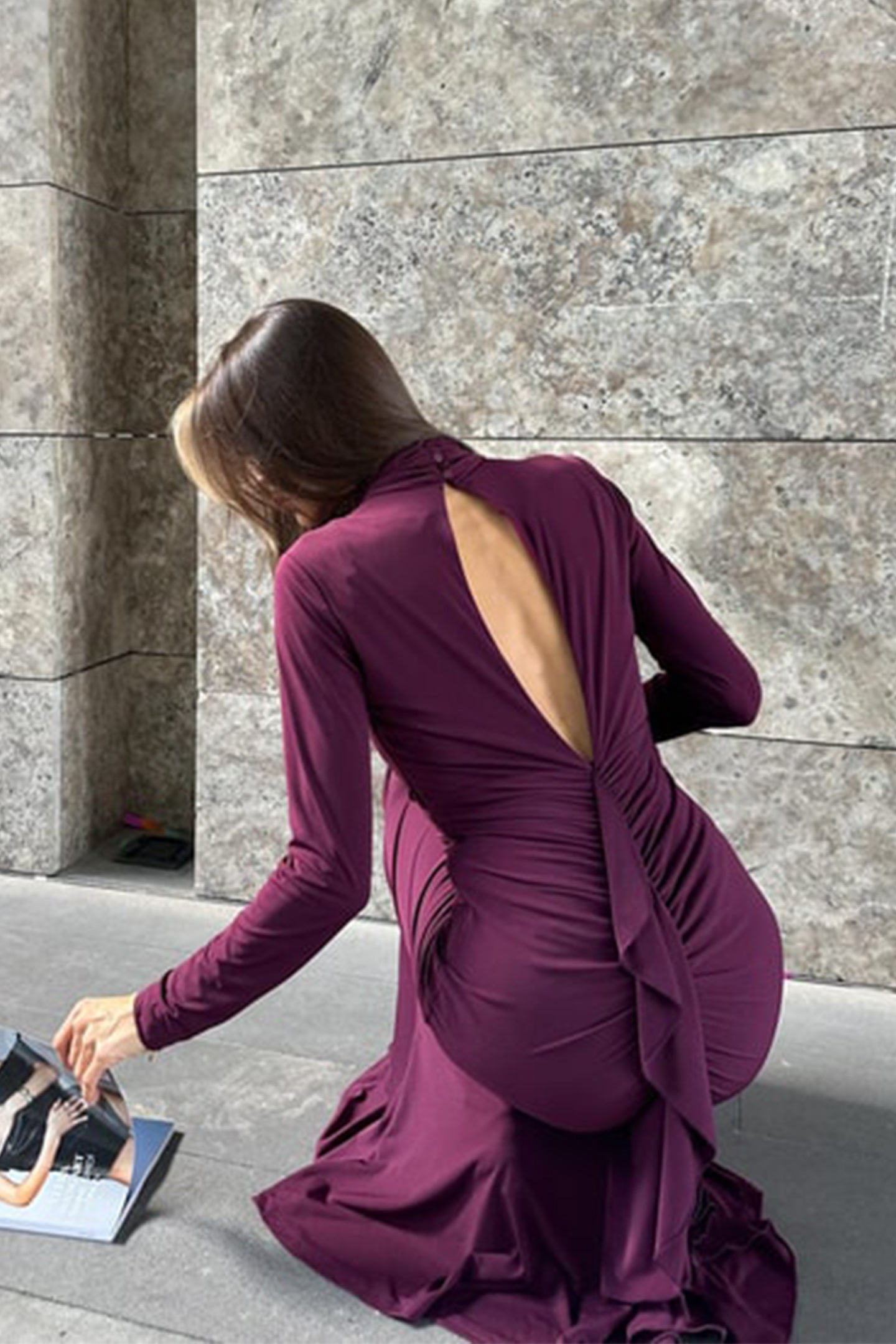 Decorative Cutout, High Neck, Long Sleeve, Ruched, Backless, Maxi Length.