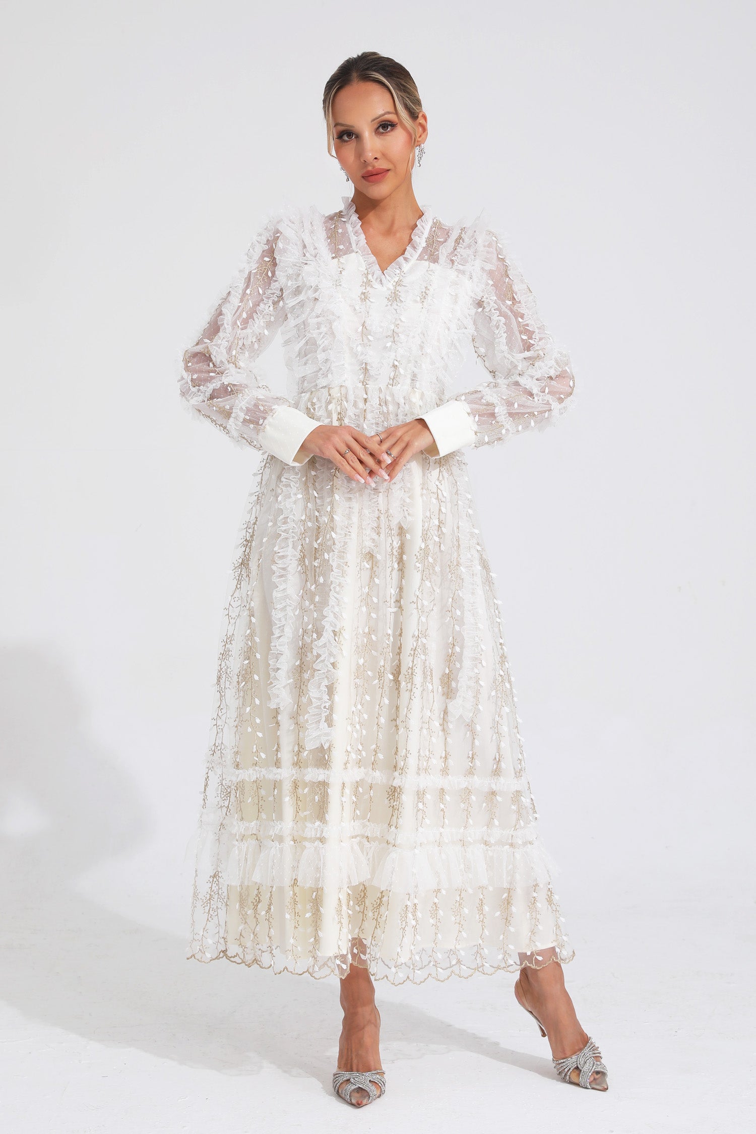 Elevate your style with the exquisite Sally White Mesh Maxi Dress. Crafted with attention to detail, this dress features a flattering V-neckline and delicate vertical branches in sheer mesh fabric. Its sophisticated design is perfect for special occasions or elegant evenings out. Step into the limelight with confidence and grace in this stunning maxi dress.