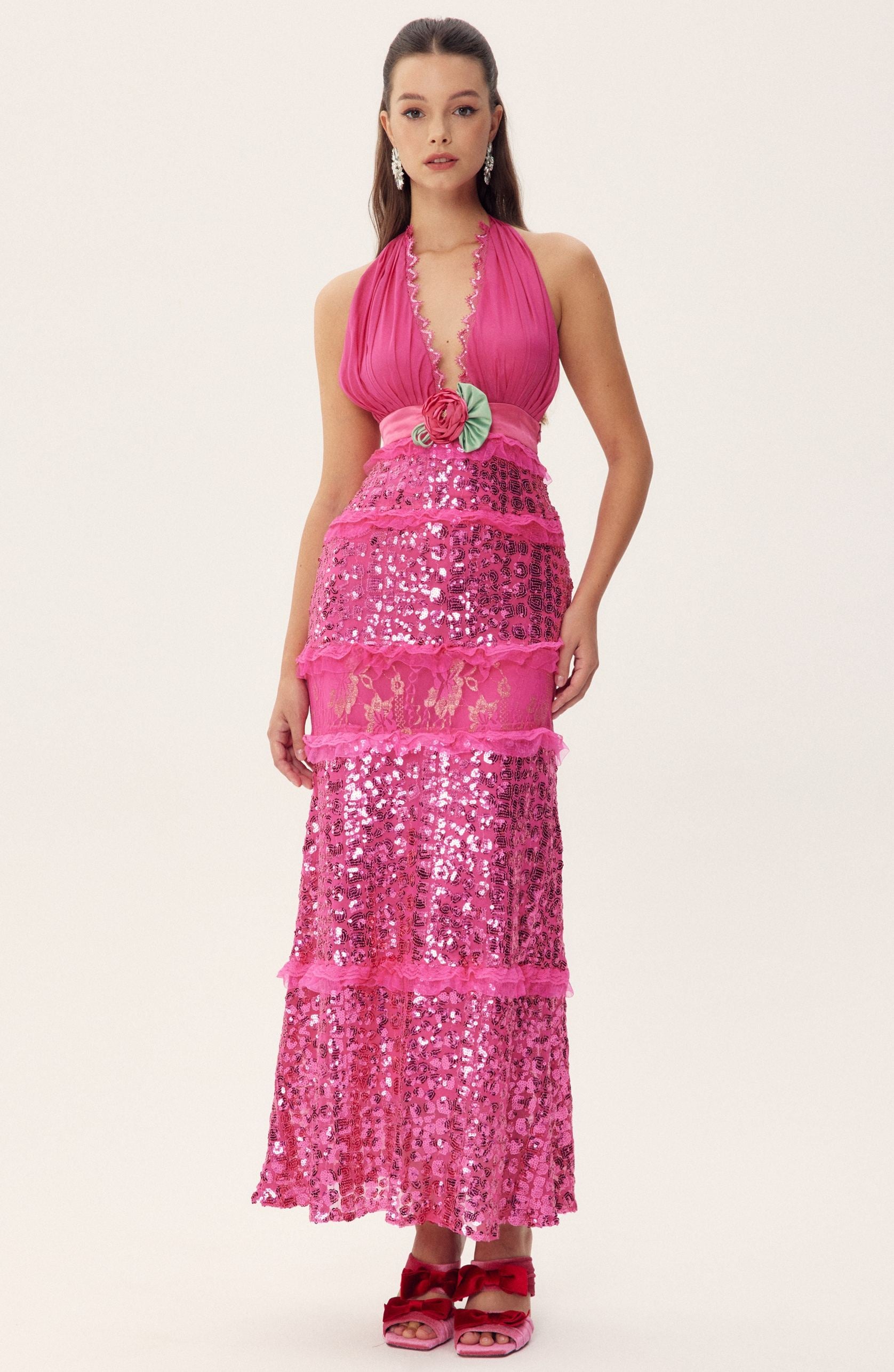 - Backless, Floral Embellished, V-neck, Ruffle, Sequins Embellishment, Maxi Length.