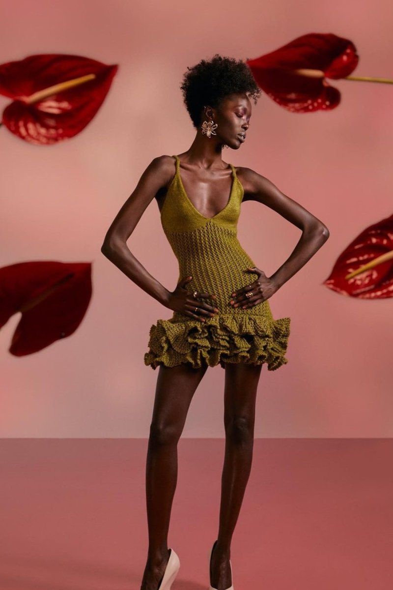 - V-neckline, Sleeveless, Crochet Detailing, Ruffle Accents, Slight Flare, Mini Length.